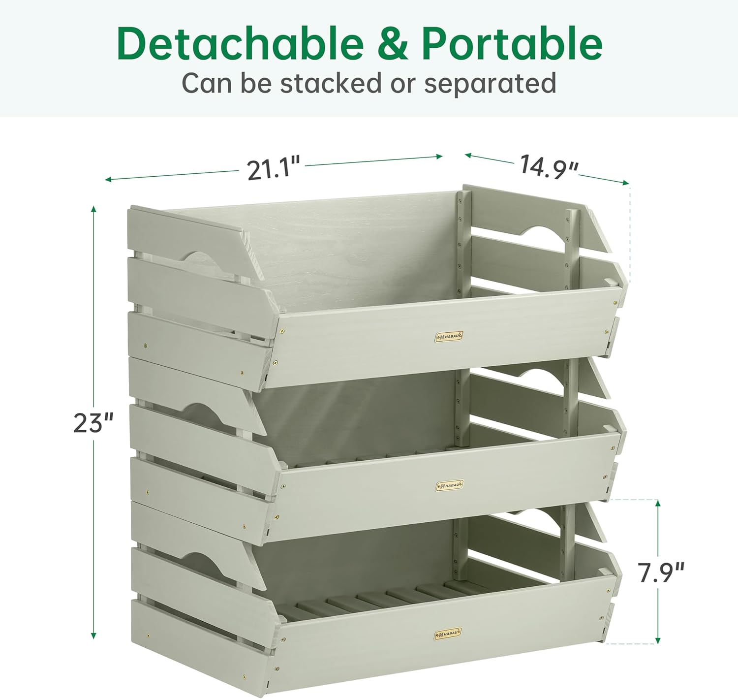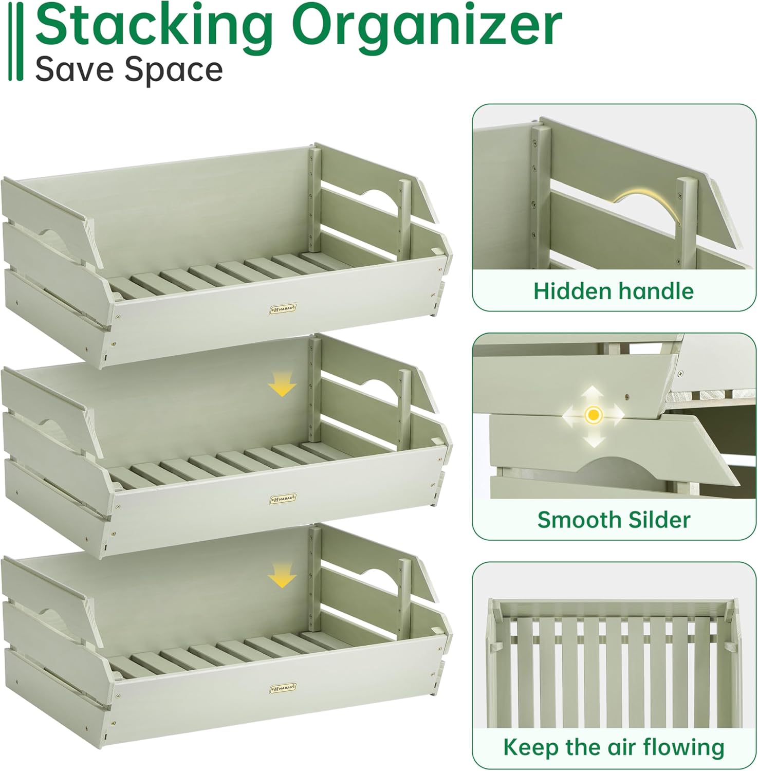 HABAU Wood Potato Onion Storage Bins - Wooden Stackable Produce Basket - Fruit Vegetable Storage for Kitchen Pantry Organization, Set 3 Pieces