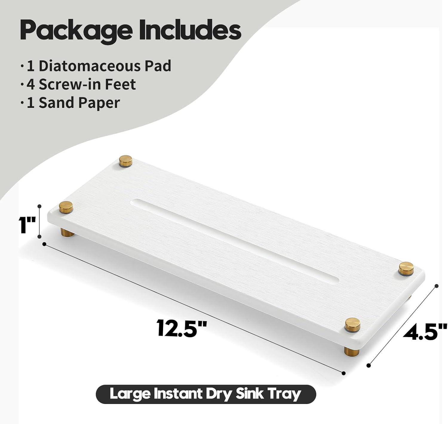 Water Absorbing Stone Sink Caddy Kitchen Sink Organizer Tray, Diatomite Bathroom Counter Tray, Gold Faucet Drying Mat Coaster Soap Dish Rack Riser Dispenser Sponge Holder, White 12.5" x 4.5"