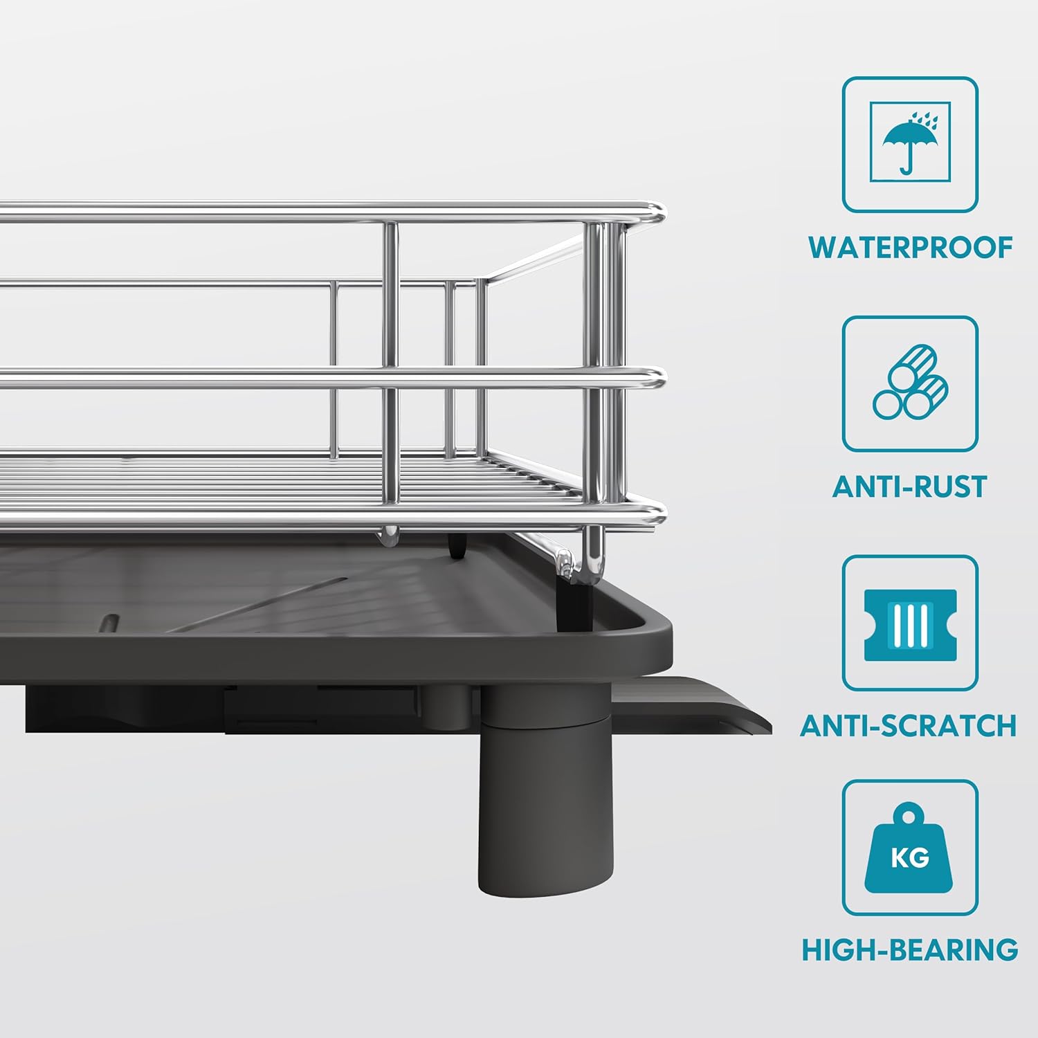 - ✅Quick-Drain: Dish Rack Comes with auto drain tray set, guided channels and extended spout route water smoothly to sink, preventing water droplets leftover on the counter
