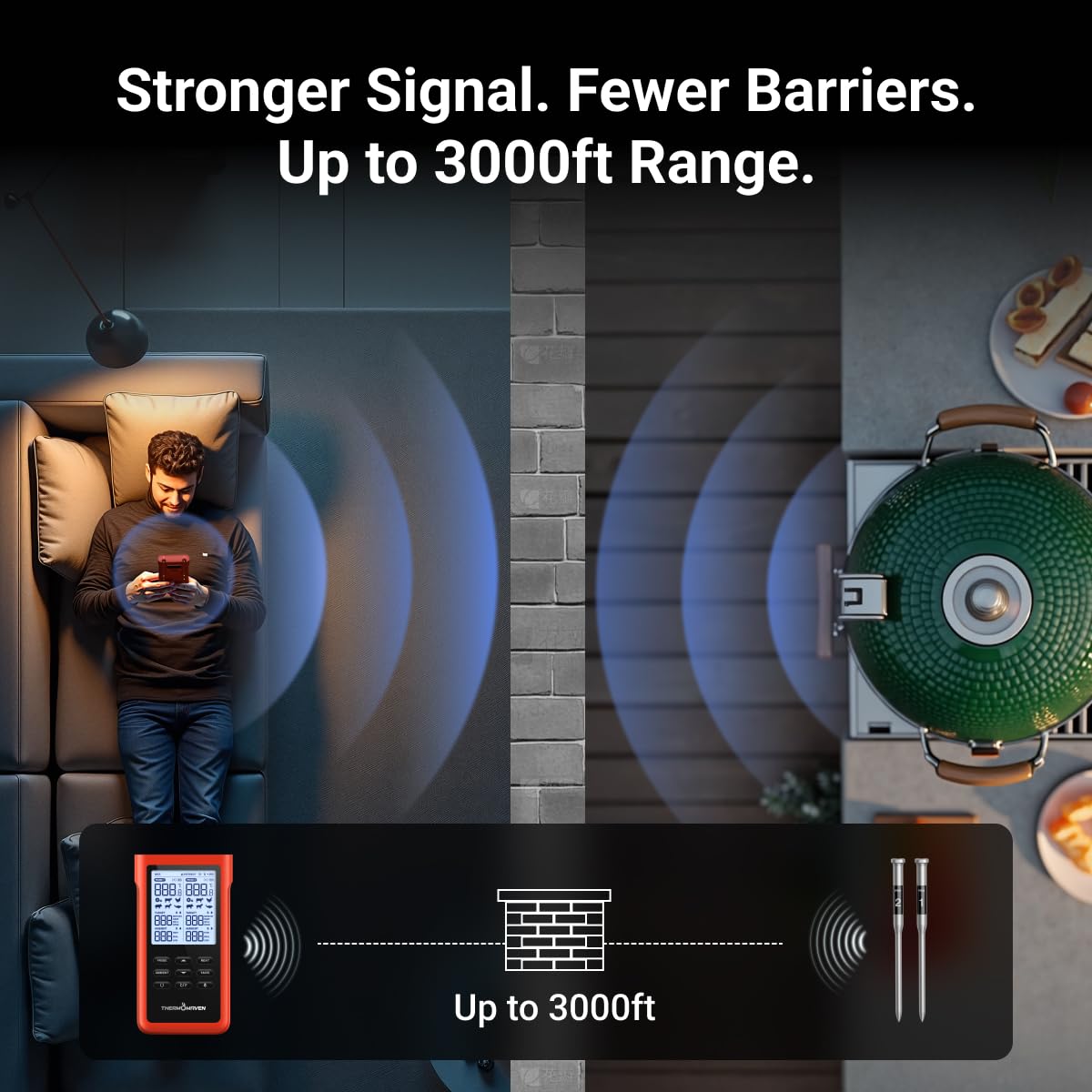 - Ultra-Long Wireless Range:Monitor your food from up to 3000 feet away with Sub-1G wireless technology, which has stronger penetration than bluetooth and delivers signals more stably. Perfect for outdoor BBQs, grilling, or large kitchens, giving you freedom to move without missing a temperature change.