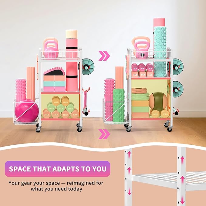 3-Tier Home Gym Storage Rack, Adjustable Yoga Mat Storage Rack, 250LBS Metal Workout Equipment Storage Cart with Large Basket & Lockable Wheels for Mats, Bands, Foam Rollers, Yoga Block