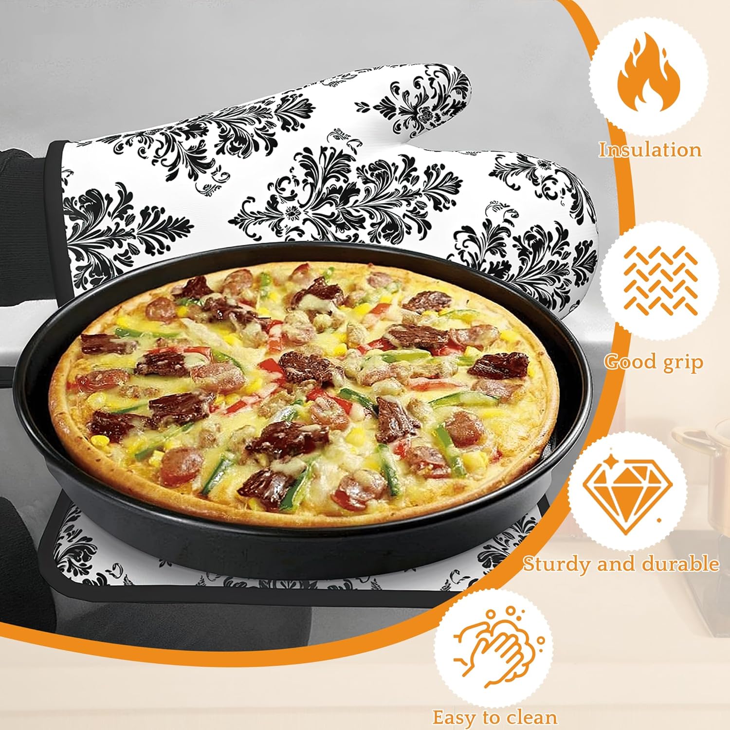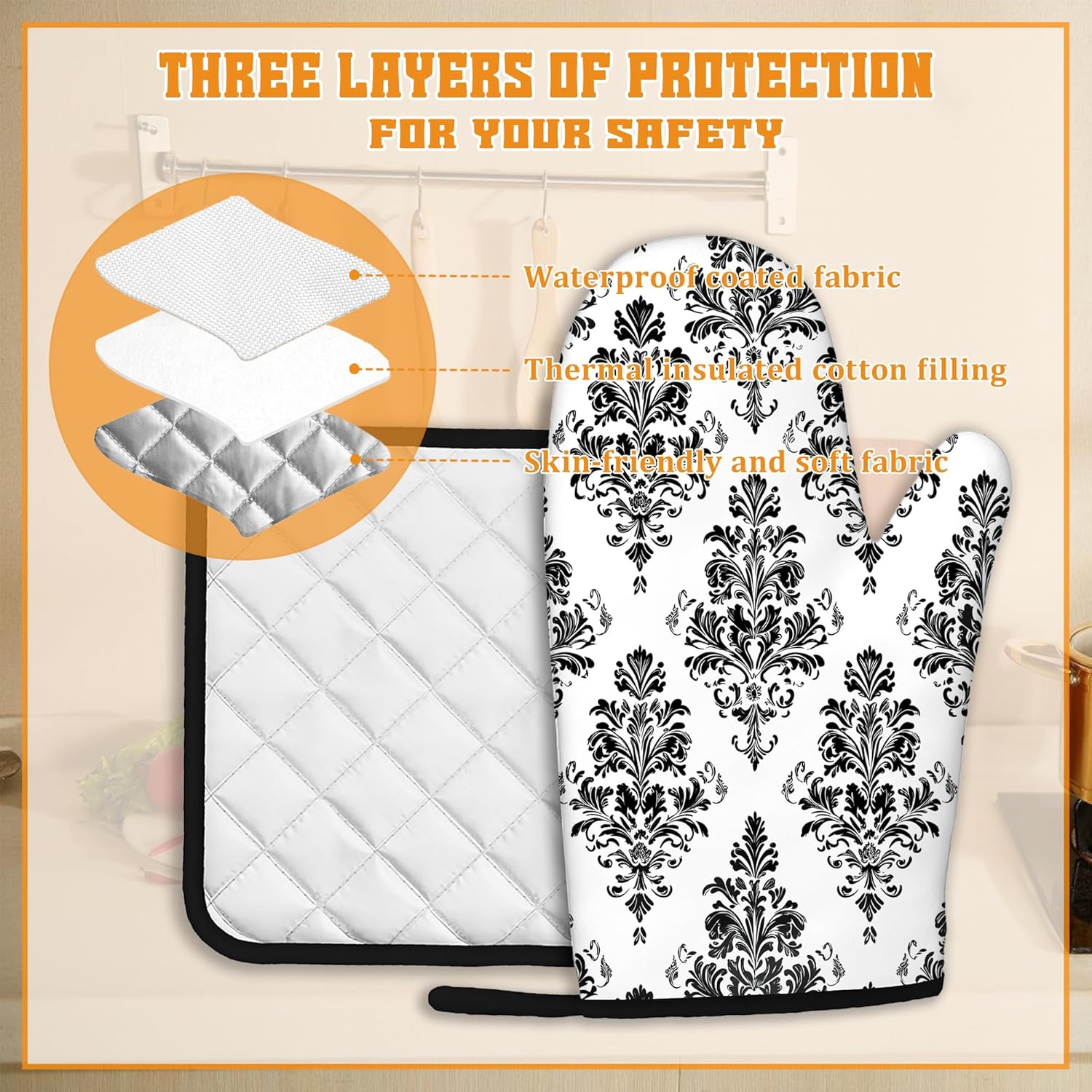 Vintage Damask Floral Oven Mitts and Pot Holders,Heat Resistant Oven Mitts Gloves and Pot Holder for Home Kitchen Decorations Cooking Baking BBQ Gifts,Set of 4