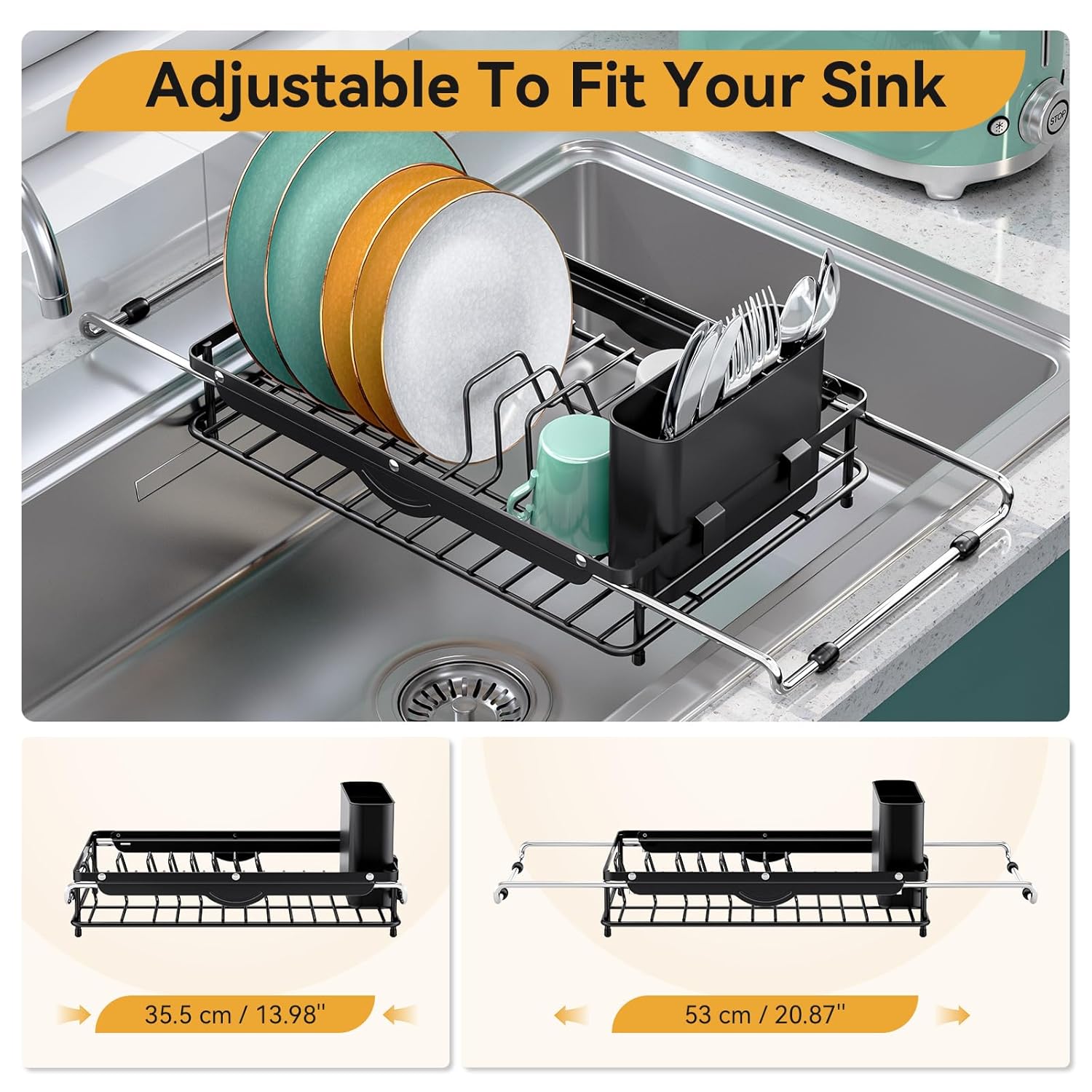 - [EXPANDABLE DESIGN]: Thanks to the extendable design, our over the sink dish drying rack adapts to various spaces. It spans sinks measuring 20.98"D x 9.61"W x 2.99"H. The adjustable 304 stainless steel support bars can expand from 13.98" to 20.87" to fit various sink sizes.