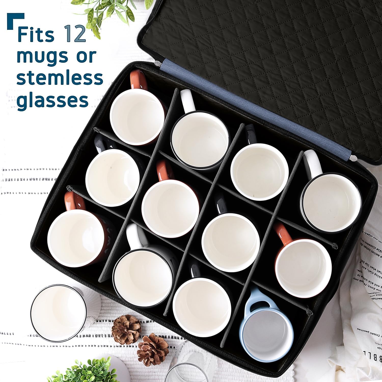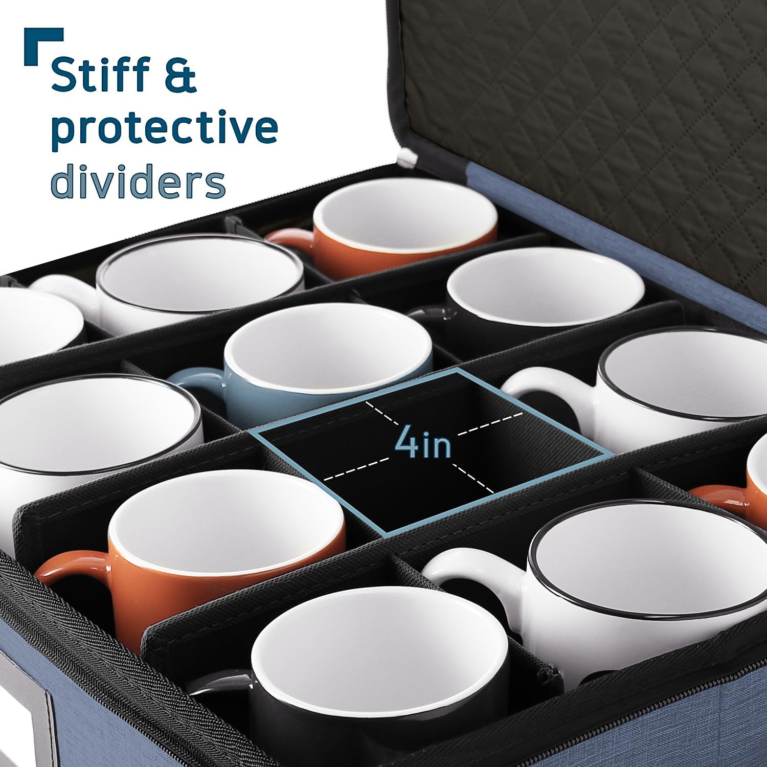 Hearth & Harbor Coffee Mug Storage, Quilted and Stackable Coffee Cup Storage Organizer for Service of 12, Mug Storage Box with Dividers, China Containers Hard Shell for Moving and Organization, Blue