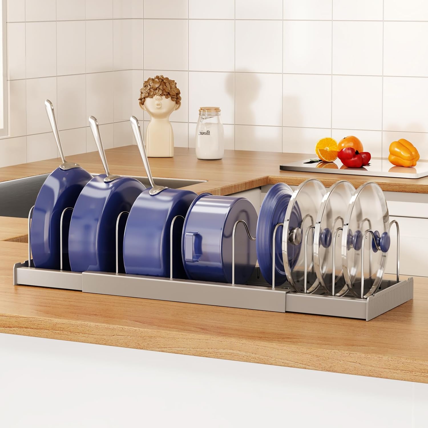 - 【Expandable Design】It measures (12.6"~22.4") L*7.9" W*6.3" H, which can be stretched freely to adapt to different cabinet sizes, suitable for small apartments to large kitchens, large capacity to meet the storage needs of different pots and pans, compatible with a full range of kitchen utensils from frying pans to soup pots.