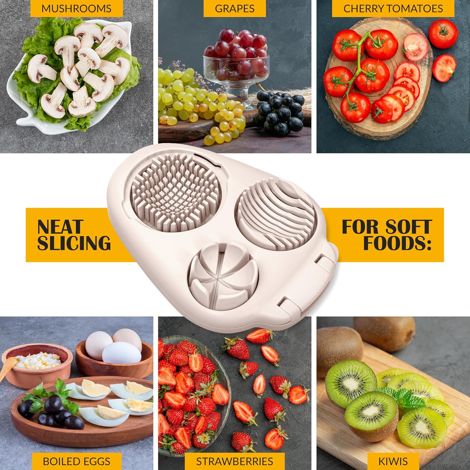 - ๐จ๐ป๐ถ๐๐ฒ๐ฟ๐๐ฎ๐น ๐๐ถ๐๐ฐ๐ต๐ฒ๐ป ๐ง๐ผ๐ผ๐น: The egg dicer for hard boiled eggs is an essential everyday tool; you can use it for eggs as well as a strawberry slicer, mushroom slicer, tomato slicer, grape slicer, kiwi slicer, olive slicer and other non-solid foods; every dish will taste delicious, and also look amazing