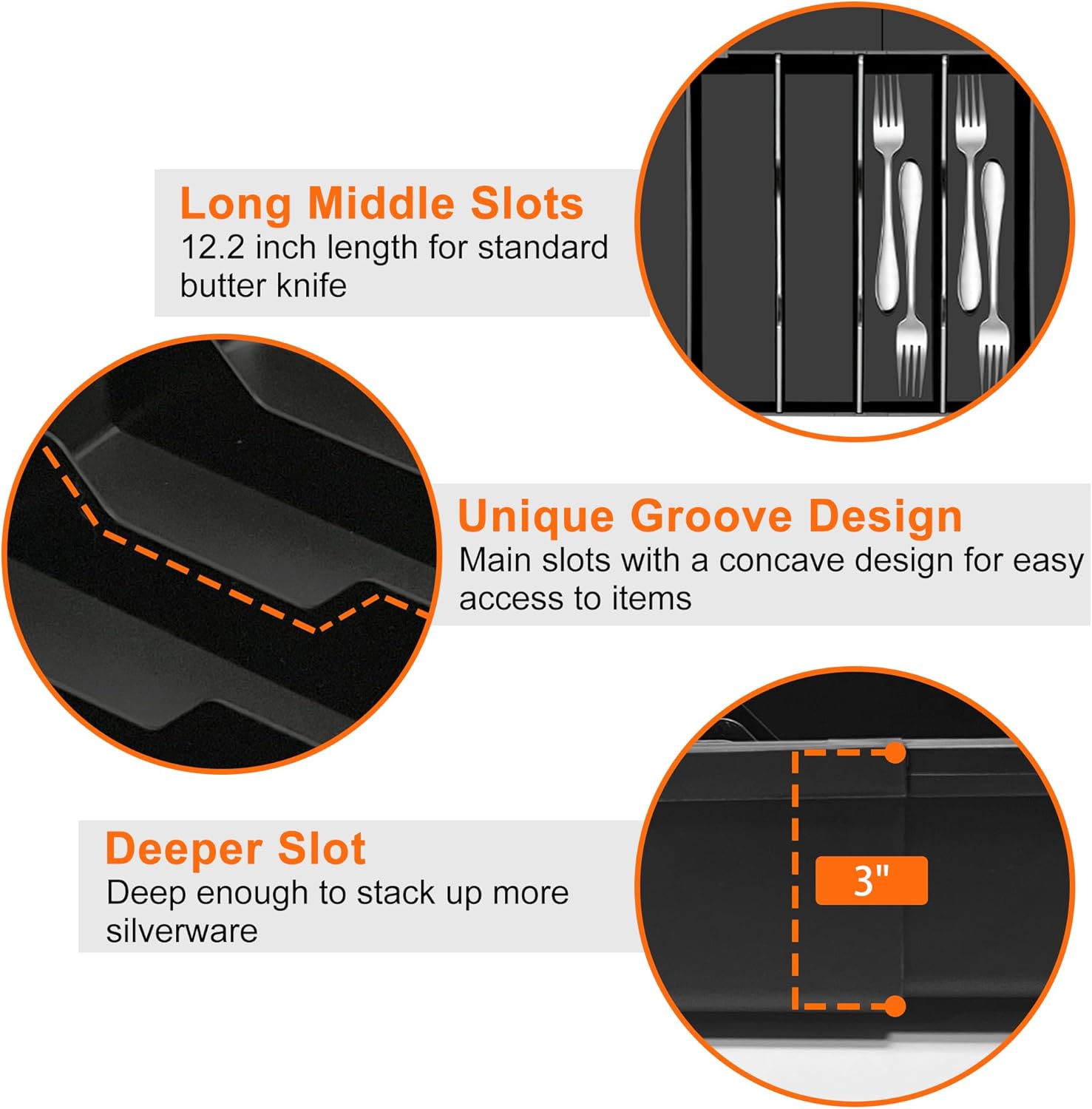 - Maximize Drawer Space: With our 3-way expandable design, this black silverware organizer offers unparalleled flexibility, allowing for left, right, and upward expansion. This transforms it from a compact tray to a full-sized storage solution. All the edges are thinner than those of other silverware organizers, which magnifies your kitchen drawer storage space
