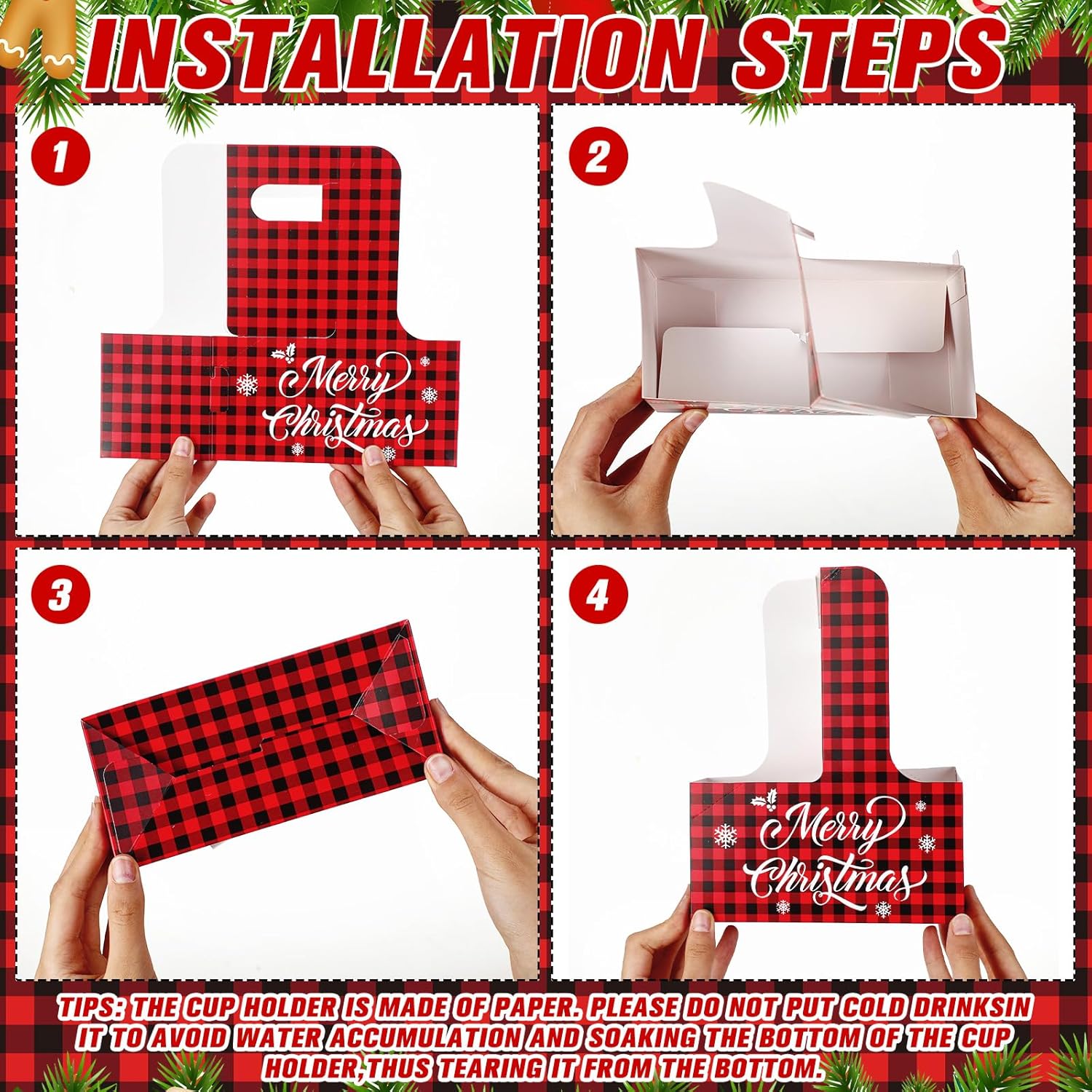 - Christmas Atmosphere: add a touch of festive charm to your beverages with the Christmas red and black buffalo plaid drink carrier; Featuring a classic holiday design with the phrase "Merry Christmas, " these Christmas cardboard cup holders are perfect for spreading holiday cheer; Whether for business takeout, restaurants, or a cozy coffee shop gathering, enhance the atmosphere with these delightful Christmas drink carrier 2 cup options