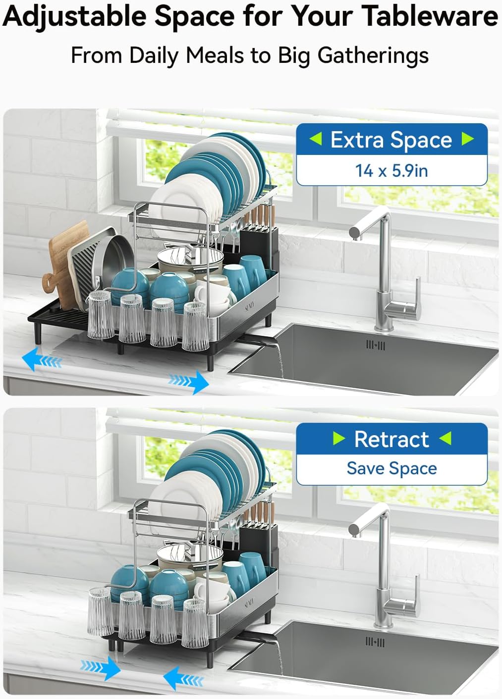 - [Expandable Design offers Extra Space 14*5.9ββ]: The SUNLY expandable dish drying rack features a extendable multifunctional drainboard that offers an extra 14*5.9ββ of large capacity space, giving you the flexibility to maximize drying space when needed or keep it compact to save countertop space