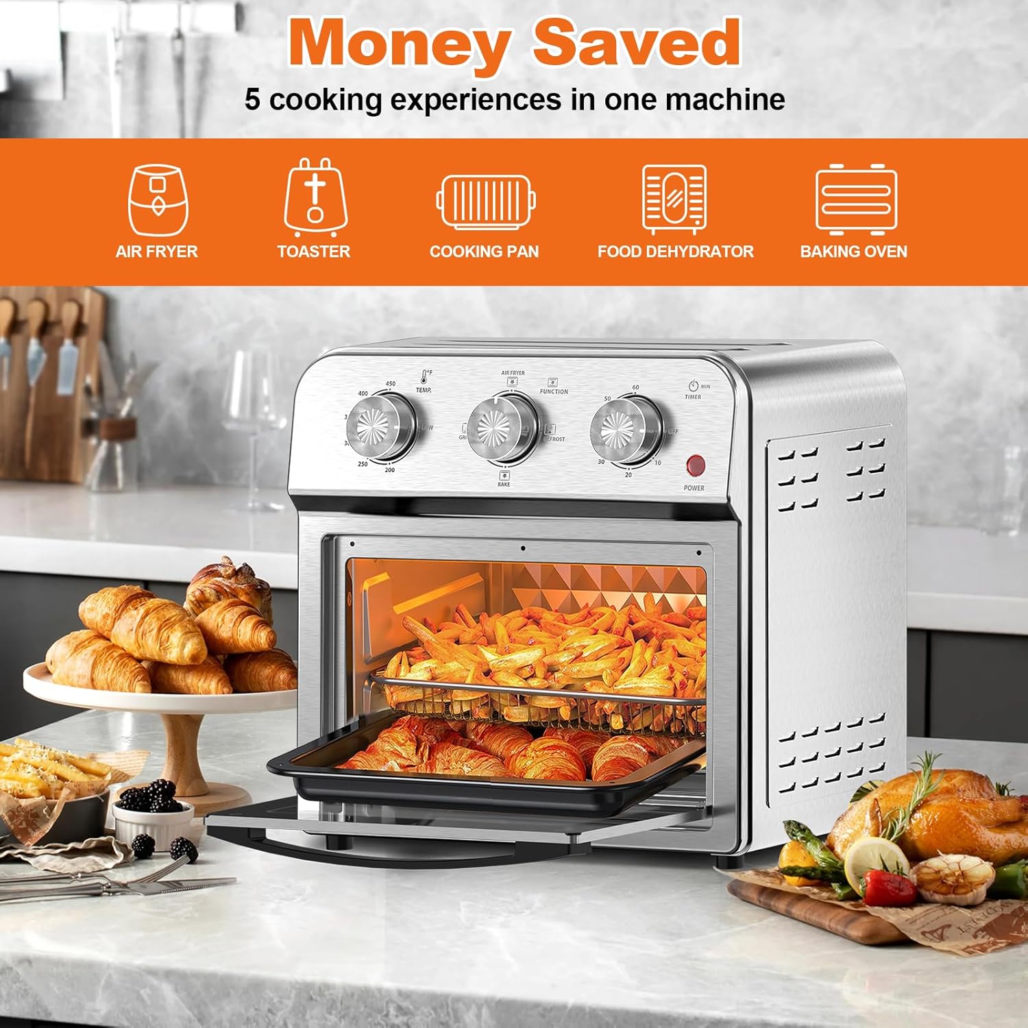 - Energy-Efficient and Durable: Boasting a powerful 1500W of cooking efficiency, the toaster Oven is constructed with stainless steel, it's not only built to last but also adds a touch of modern style to your kitchen. Its robust design ensures many years of reliable use, standing up to daily cooking tasks.
