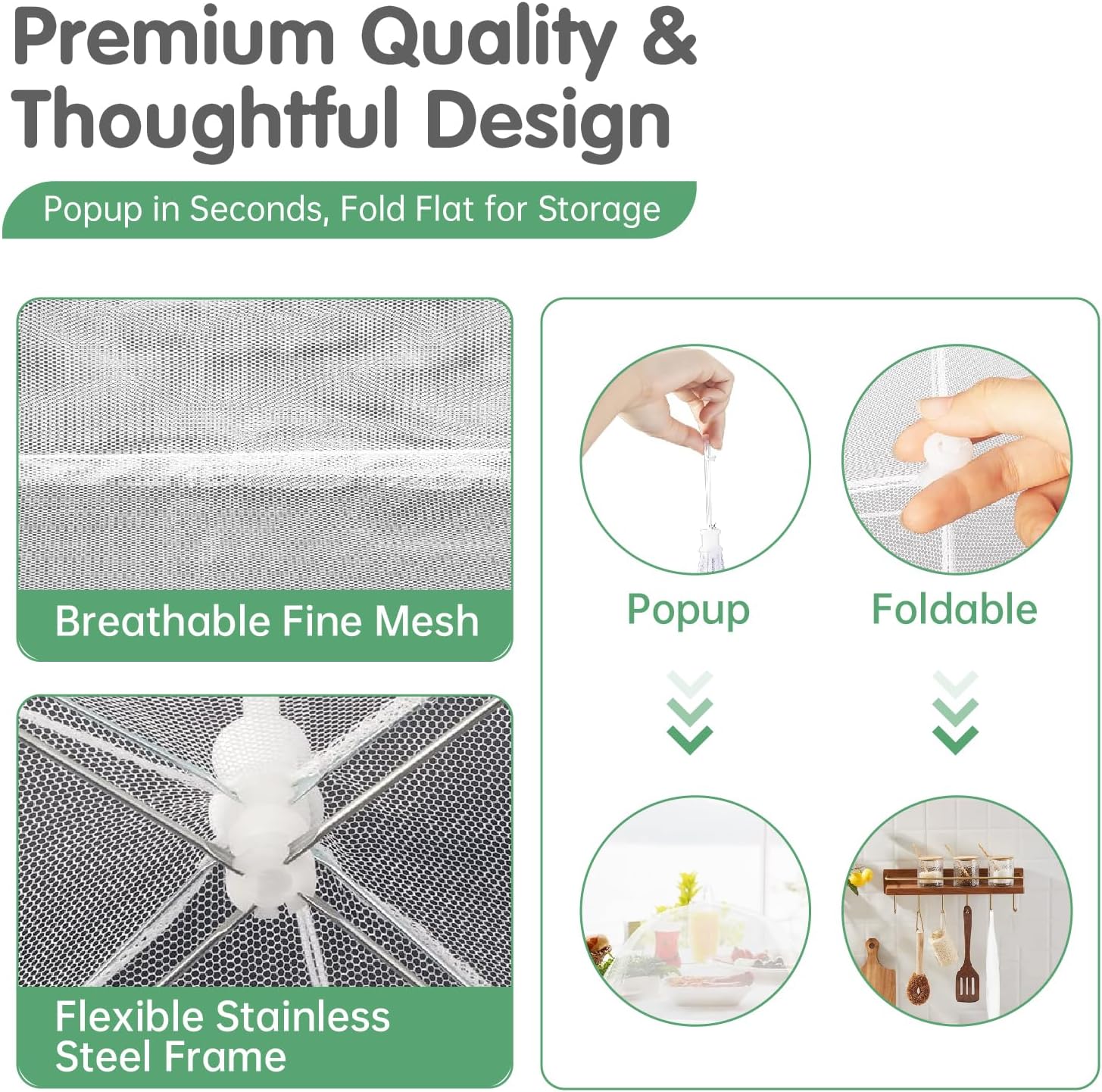 - 【Easy to Clean & Reusable】Crafted for convenience, the smooth mesh surface can be quickly wiped clean or hand-washed for maintenance. These durable food tents are reusable, offering a practical and eco-friendly alternative to disposable plastic wraps or aluminum foil.