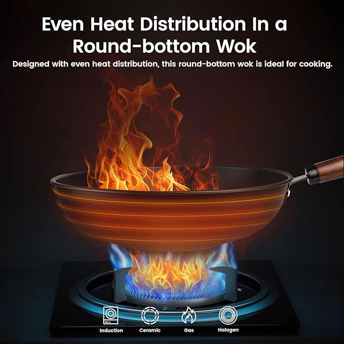 Carbon Steel Wok, 13-Inch Chinese Round Bottom Wok with lid, Woks & Stir-Fry Pans Nonstick for Induction, Electric, Gas Stoves