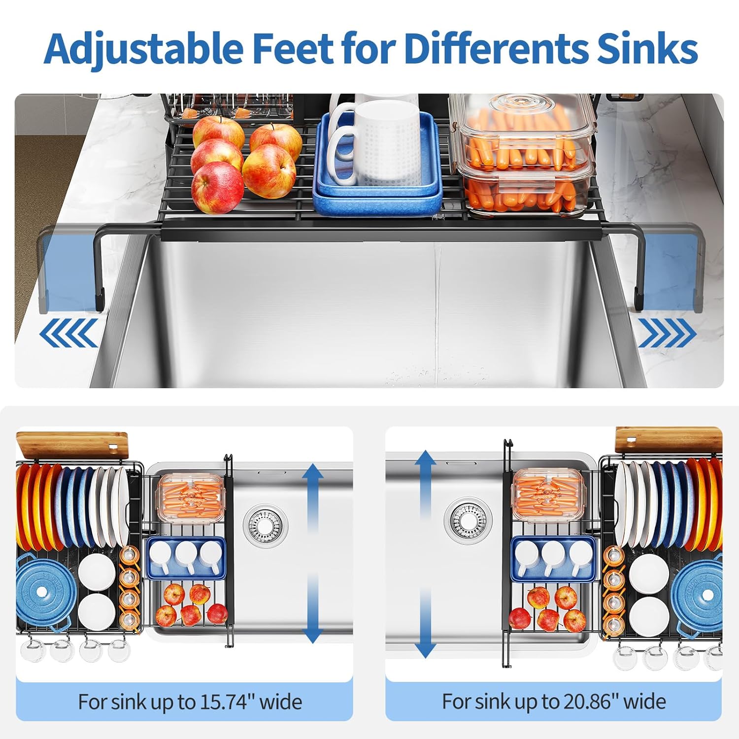 - Adjustable Feet for Sink Compatibility: The expandable over sink rack comes with 2 adjustable feet that can be customized to fit sinks of different widths. This ensures a secure and stable placement, preventing any wobbling or slipping.