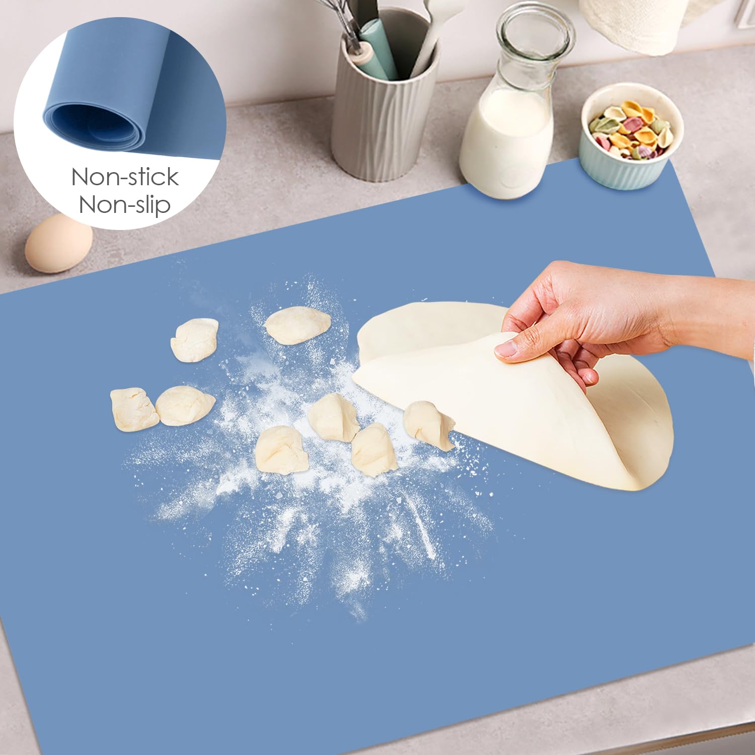 - 🎯Heat Resistant Countertop Mat: The gray blue baking mat reusable dough rolling pad resists temperatures could reach to 446℉(230℃), can protect your dining table or countertop from heat containers. Please don't put the large silicone mat near an open fire.