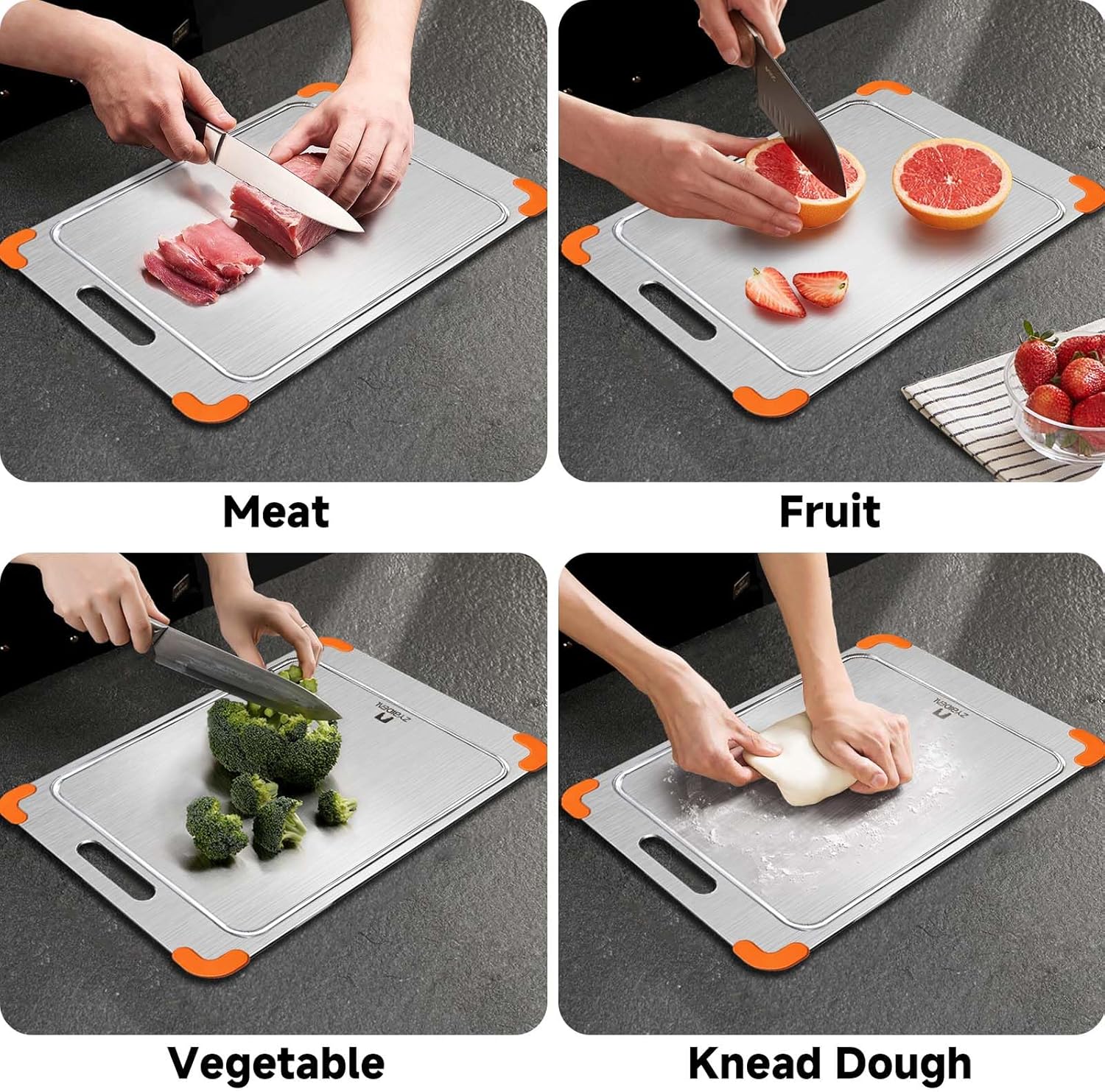 100% Pure Titanium Cutting Board with Grooves, Update Double Side Titanium Chopping Board, Silicone Anti-slip Stainless Cutting Boards for Kitchen 9 * 13 IN, Orange