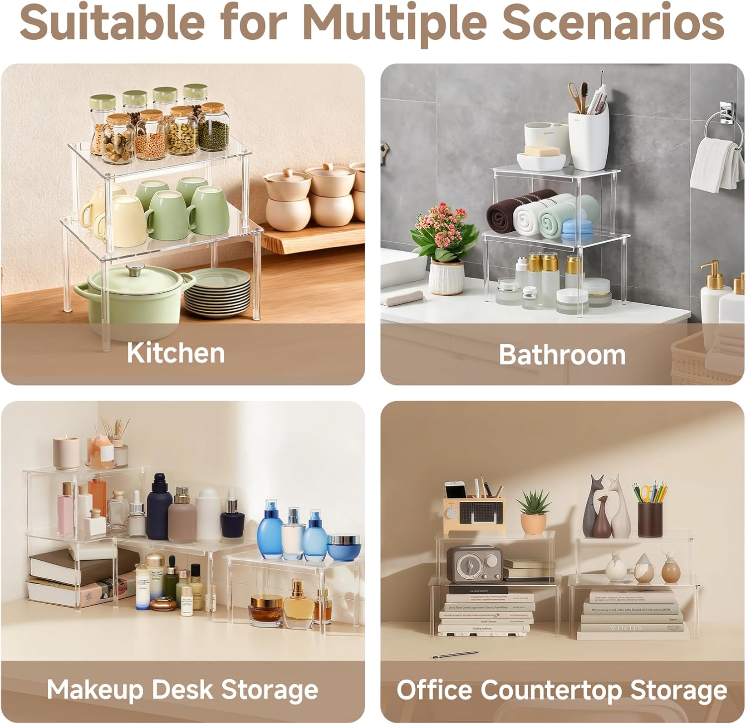 Clear Kitchen Cabinet Organizer, Set of 2 Stackable Spice Rack, Acrylic Shelves for Pantry Organizers and Storage, Tiered Spice Organization for Cabinet, Shelf Organizer for Desk Countertop