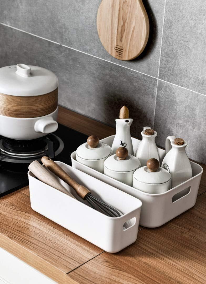 - 5-【Perfect Size】- "11 x 4 x 3.7" These storage shelves will organize your bathroom accessories while fitting in with your kitchen organization and storage. Its Flexible Size will make its use as your storage box, under bed storage, mail organizer and storage drawers. Comes in a value pack of 4 !