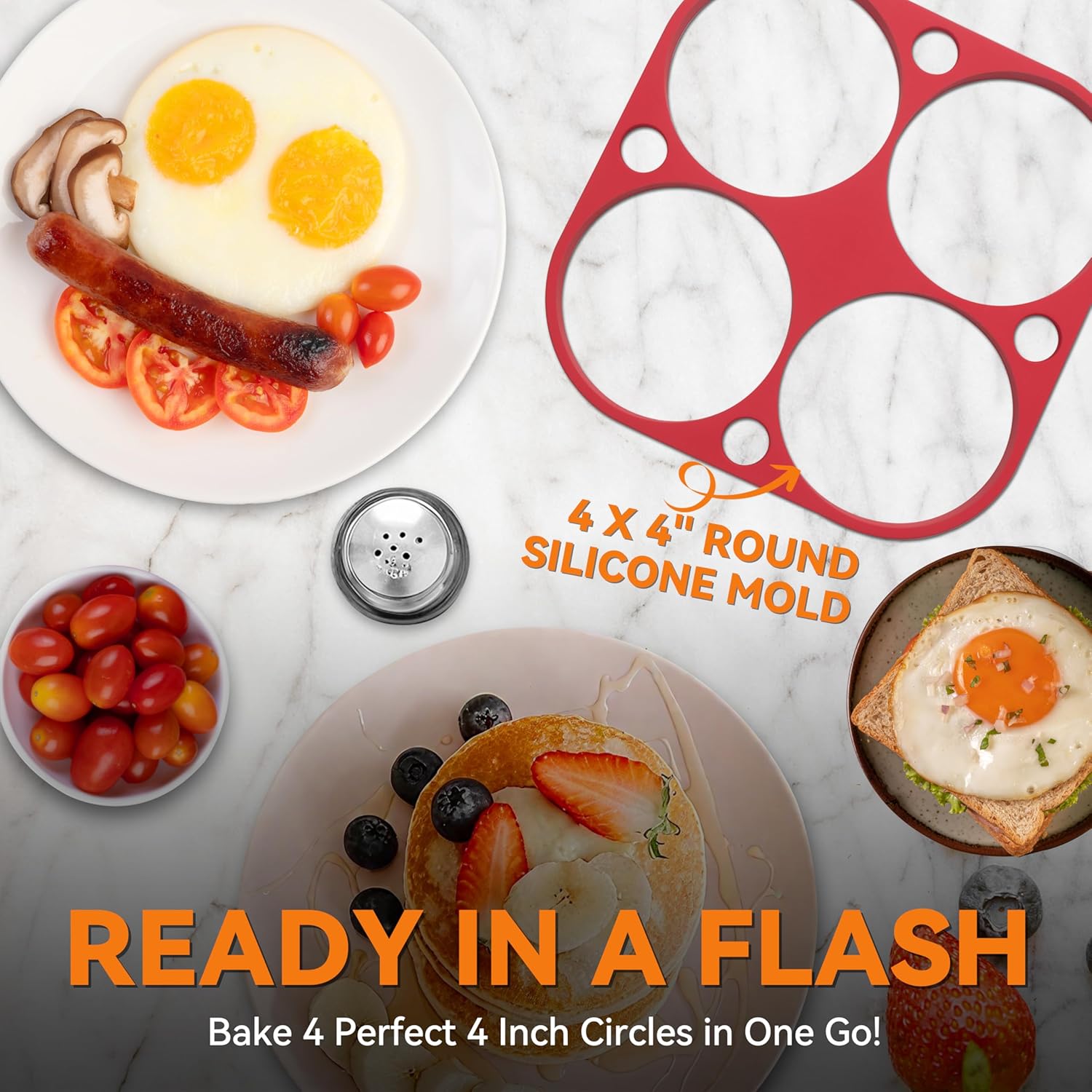 Baker's Friend 4-Round Silicone Egg Rings for Frying Eggs & Pancake, Pancake Shaper, Non-Stick & Heat-Resistant, Red
