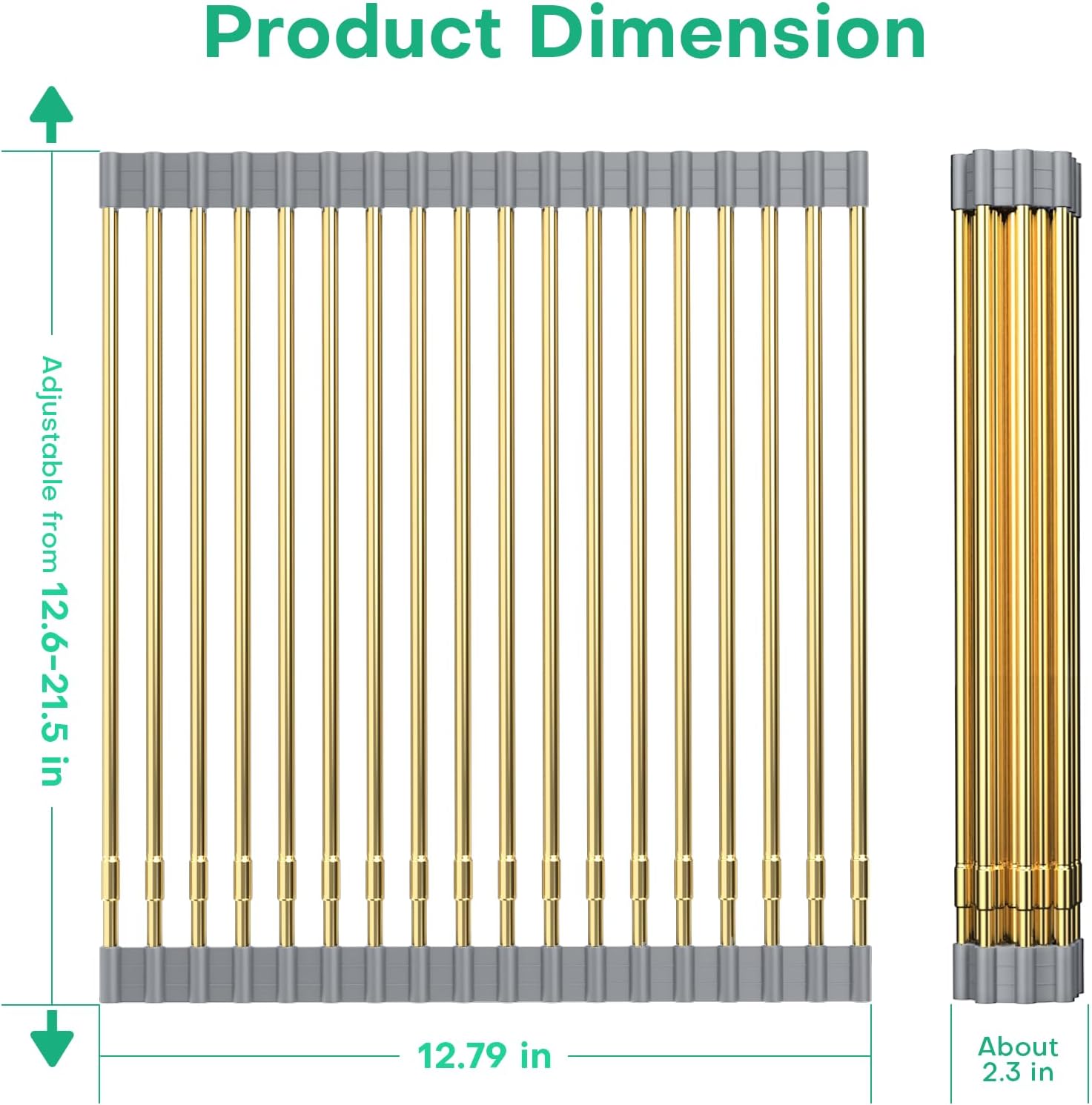 - 【Retractable Sink Drainer Roll Up】- LARGE Telescopic Drainer Rack Roll Up, The size of the roll up drain rack can be shrunk according to the required size at any time, so there is no need to worry about buying too large or too small sink roll up rack; Rolled Up Drying Rack 12.79 inches before expansion, 21.25 inches after expansion.Silicone can be cut according to needs, or the stainless steel tube can be disassembled and assembled at will.