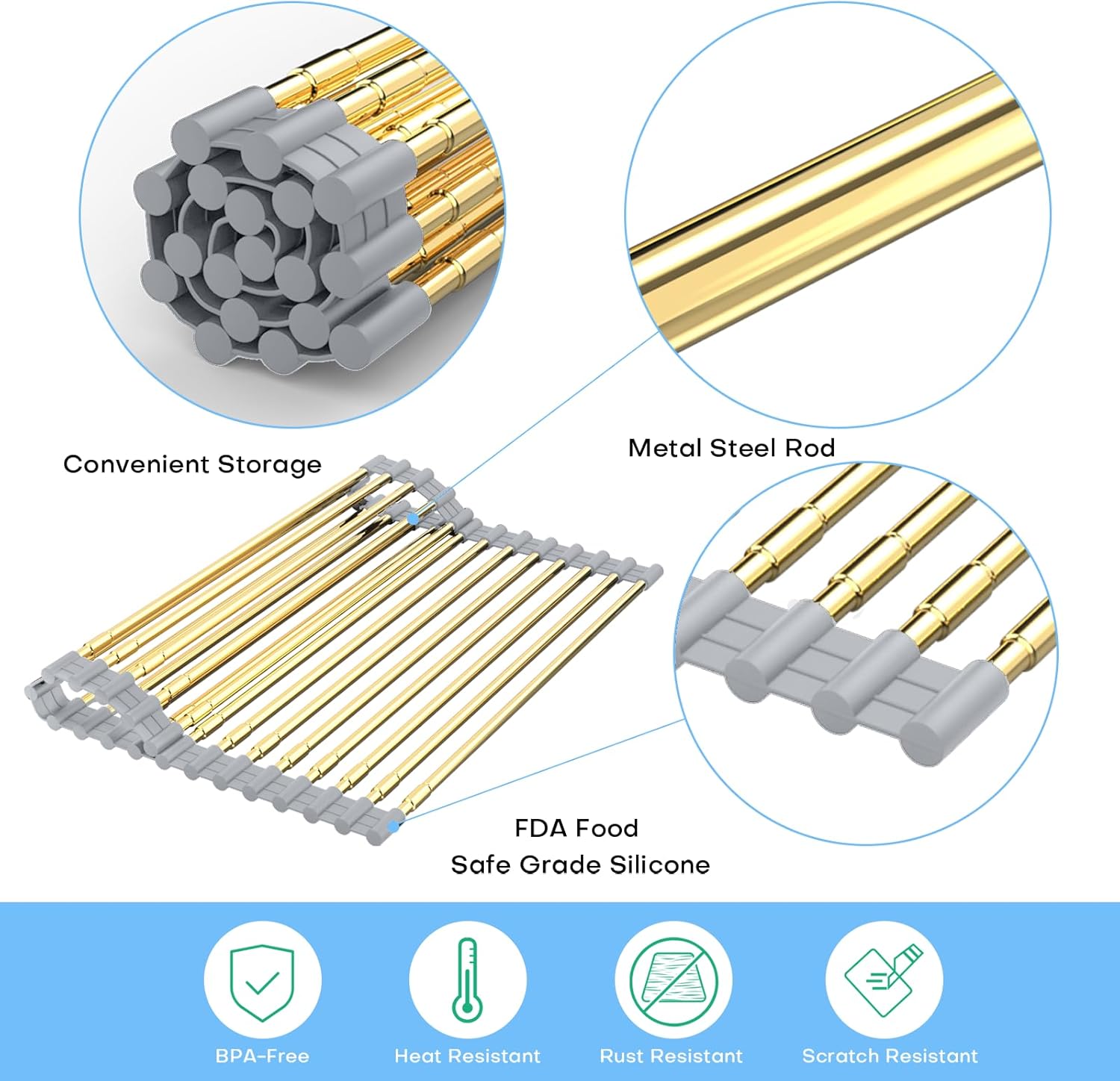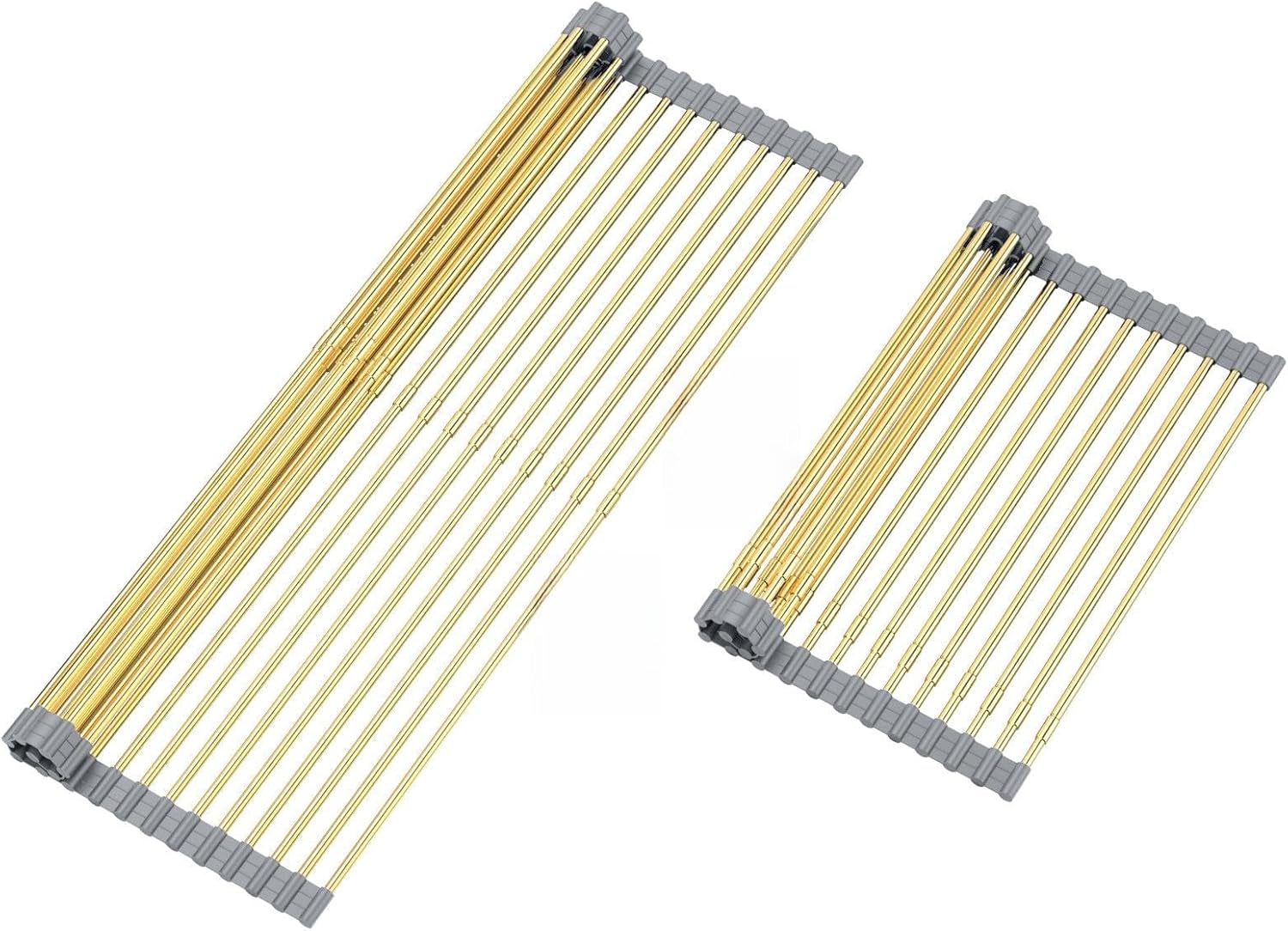 Large Expandable Roll Up Dish Drying Rack, Heat-Resistant Dish Drainer for Stainless Steel Sinks, Over The Sink Non-Slip Silicone Rollable Dish Drainer Roll Rack 18 Tube Gray Silicone & Gold Tube