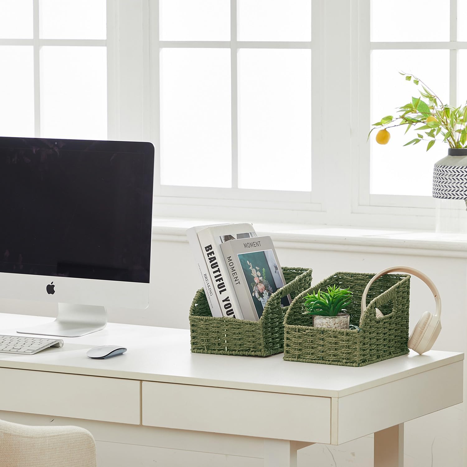Wicker Baskets for Organizing,Pantry, Kitchen Counter with Handles, Handwoven Woven Storage Baskets for Fruit, Bread, Vegetable, Paper Storage Bins for Shelves, 3 Pack, Green
