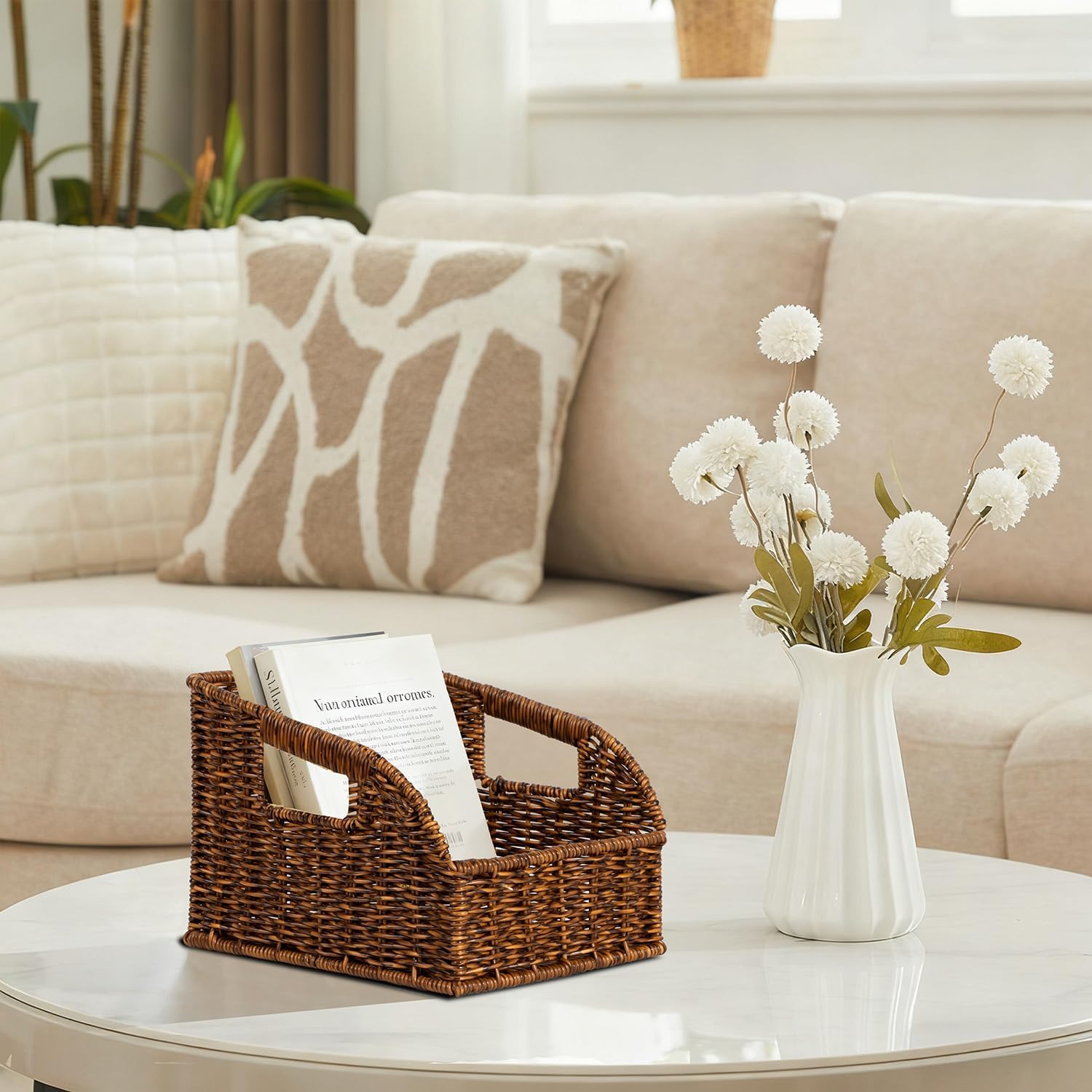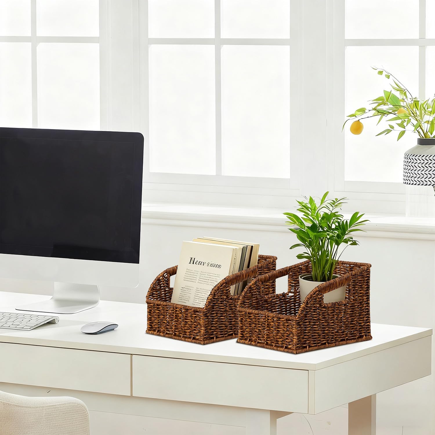 Wicker Baskets for Organizing,Pantry, Kitchen Counter with Handles, Handwoven Woven Storage Baskets for Fruit, Bread, Vegetable, Waterproof Plastic Storage Bins for Shelves, 3 Pack, Brown