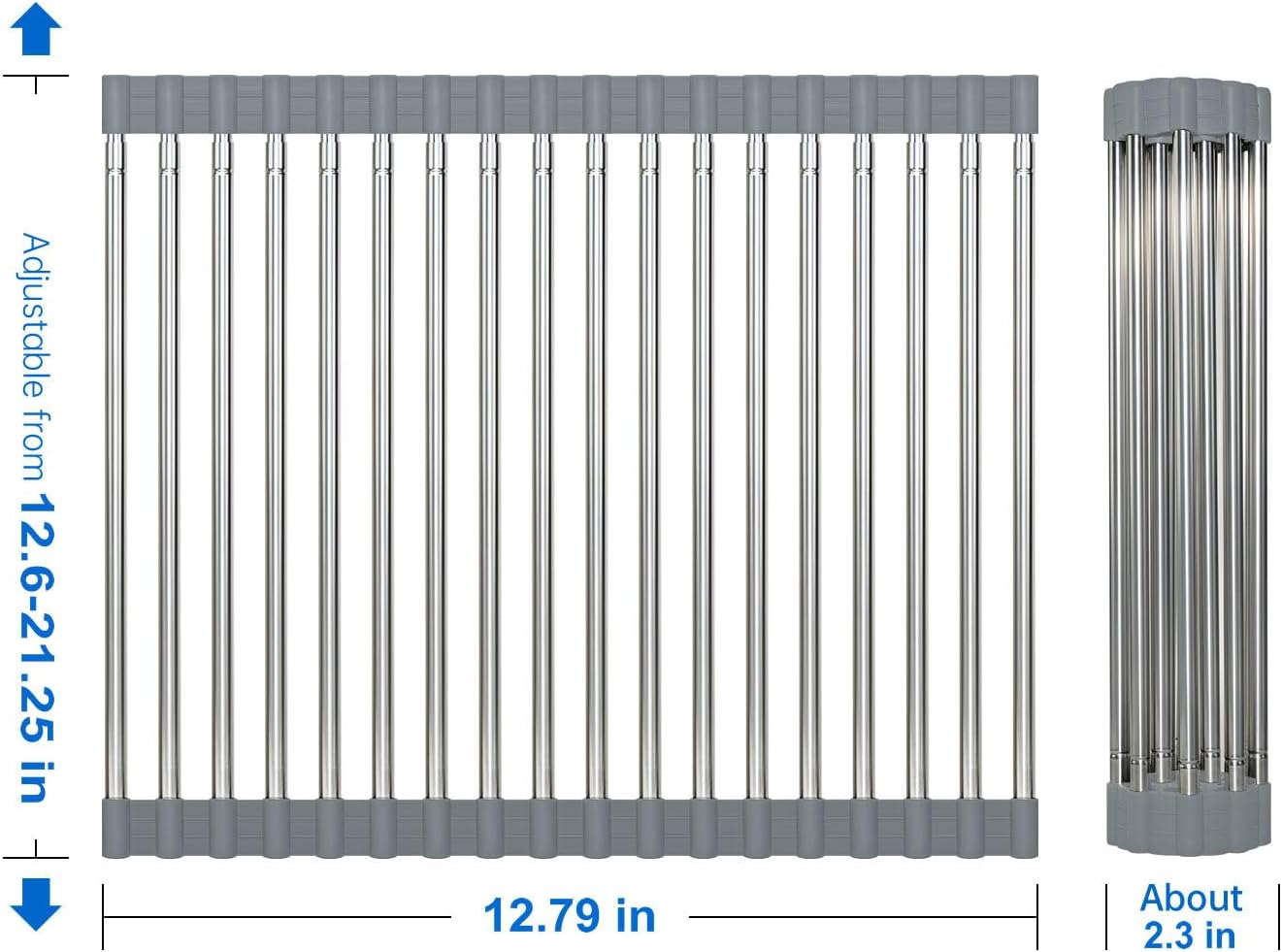- Adjustable & Roll Up Dish Drainer: The over sink dish drying rack newest upgraded roll up dish drying rack combined with expandable function, the width is 12.79" and the length of the sink dish drying rack can be adjusted according to your needs from 12.6" to 21.25". The sink dish drying rack is suitable fo most size of sinks, and it is better to confirm the size of the sink before purchasing