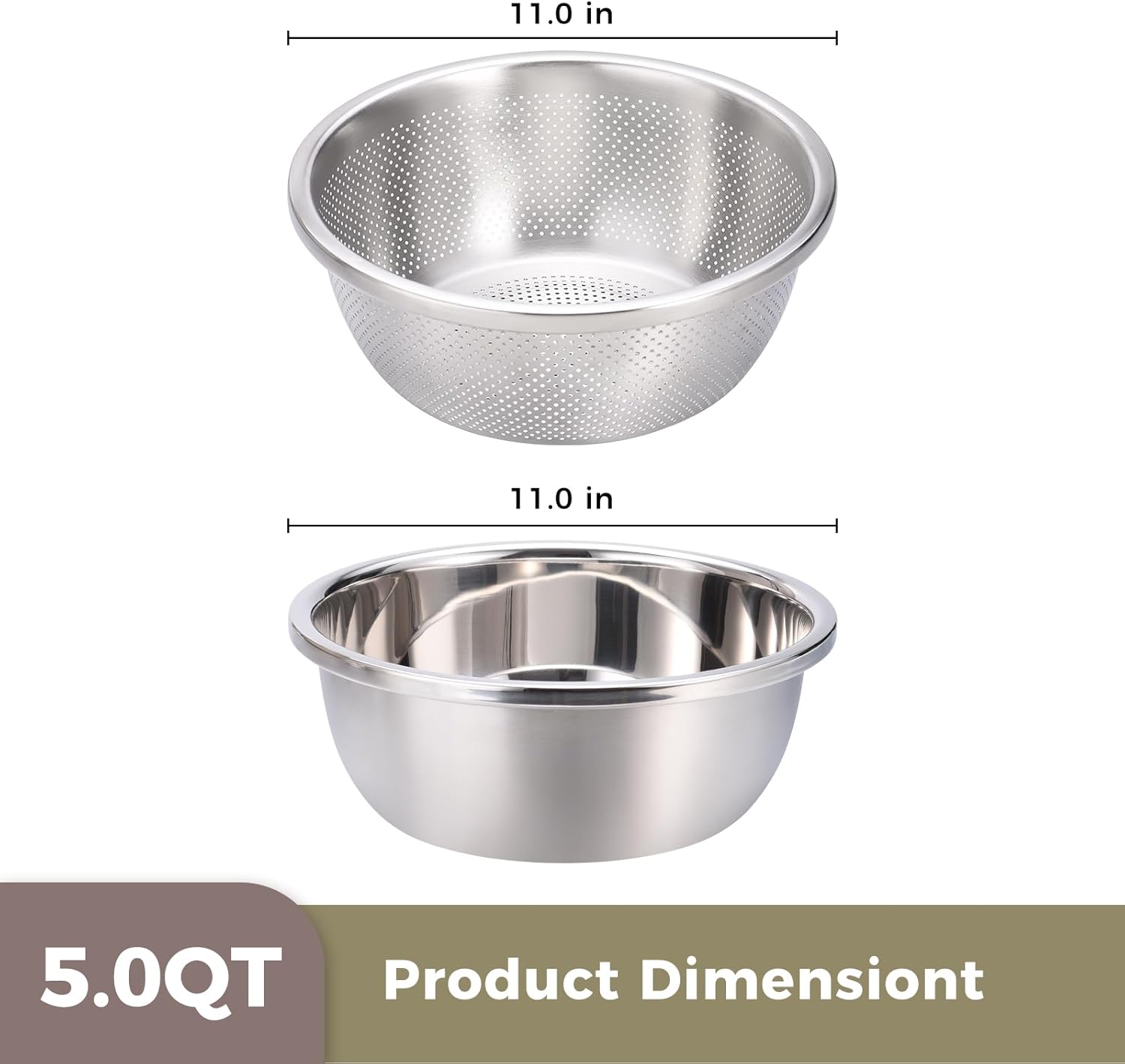 - ✨【Food-Grade 304(18/8) Stainless Steel】This strainer and bowl set are made with high-quality 304(18/8) stainless steel , It's corrosion-resistant, rust-proof, and safe for direct food contact. Ideal as a fruit washer, vegetable washer, or rice washer, it ensures healthy meal prep.