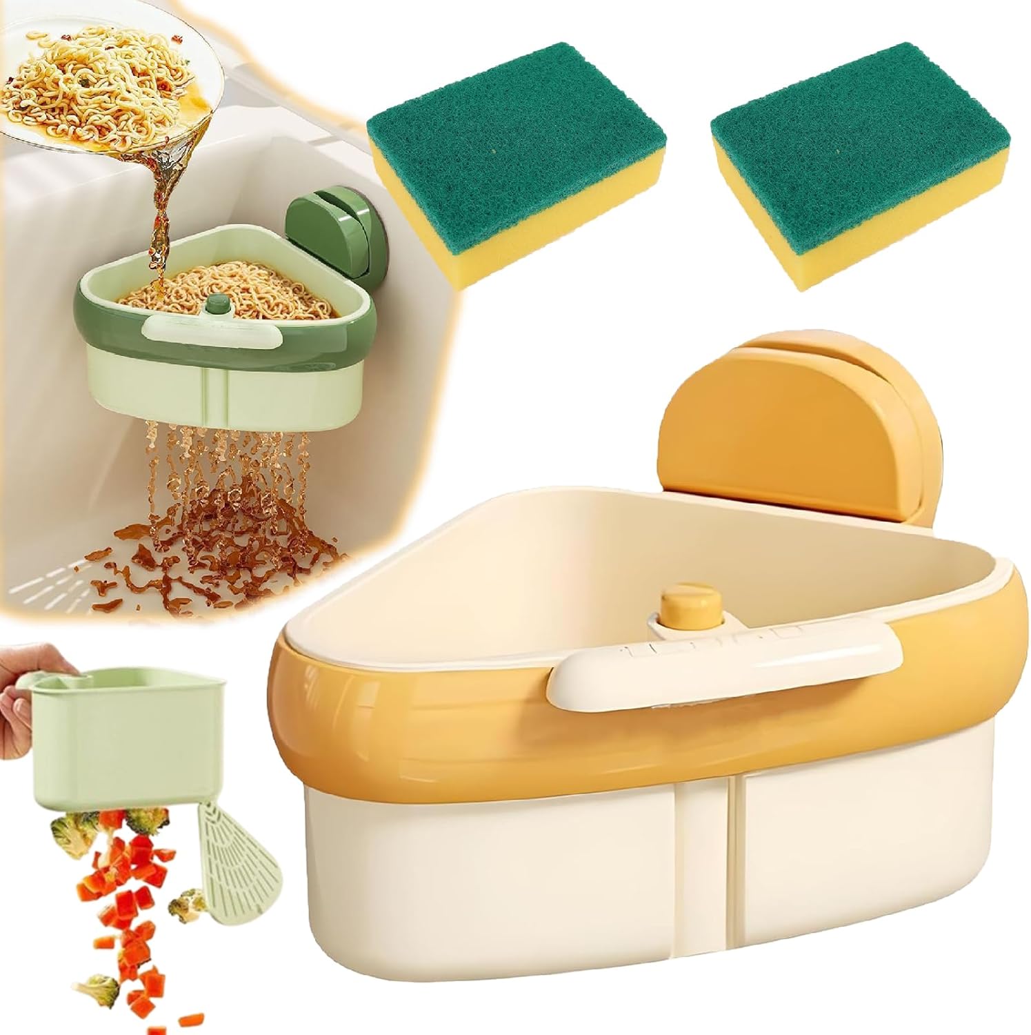 Suction Cup Sink Corner Rack, 2025 New Upgraded Sink Strainer Basket, Automatic Dumping Sink Strainer Basket, Triangular Sinks Basket Shelf with Suction Cup Sucker (Yellow)