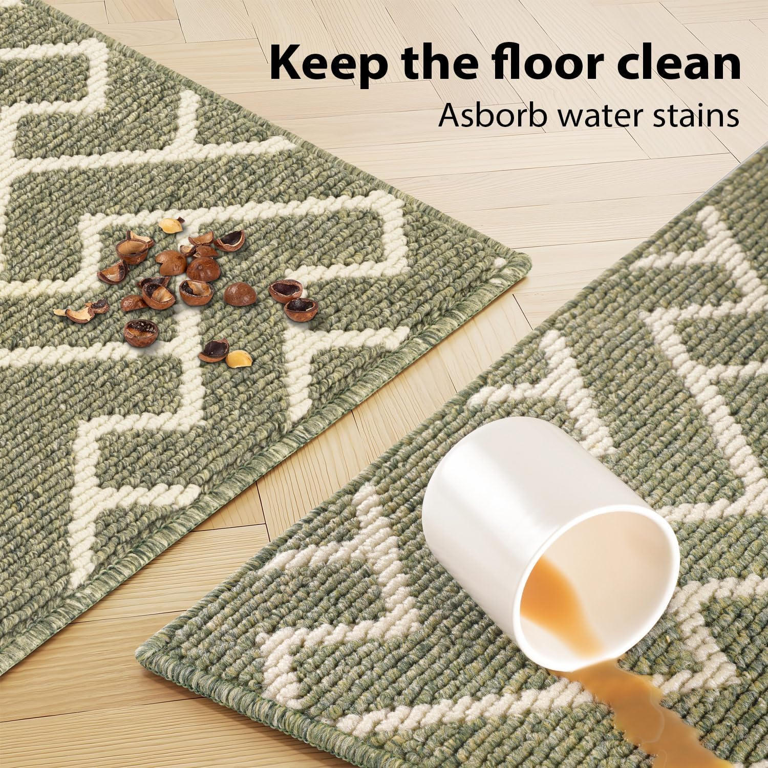 hicorfe Kitchen Rugs and Mats Sets,Non-Slip 2 Pieces Absorbent 100% Polypropylene Rug,Comfort Kitchen Runner Mat,Washable for Kitchen,Sink,Laundry(20" x 31.5" Plus 20" x 48",Green)