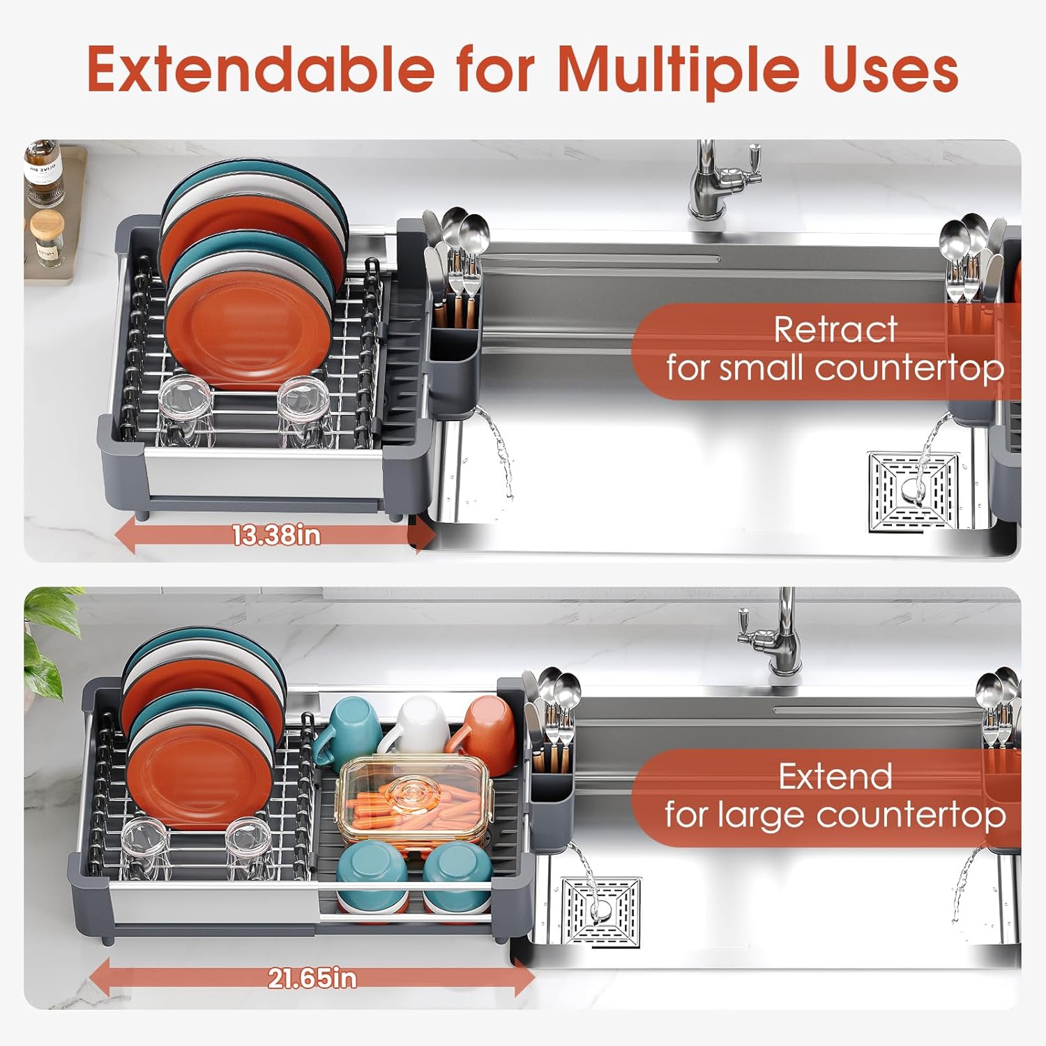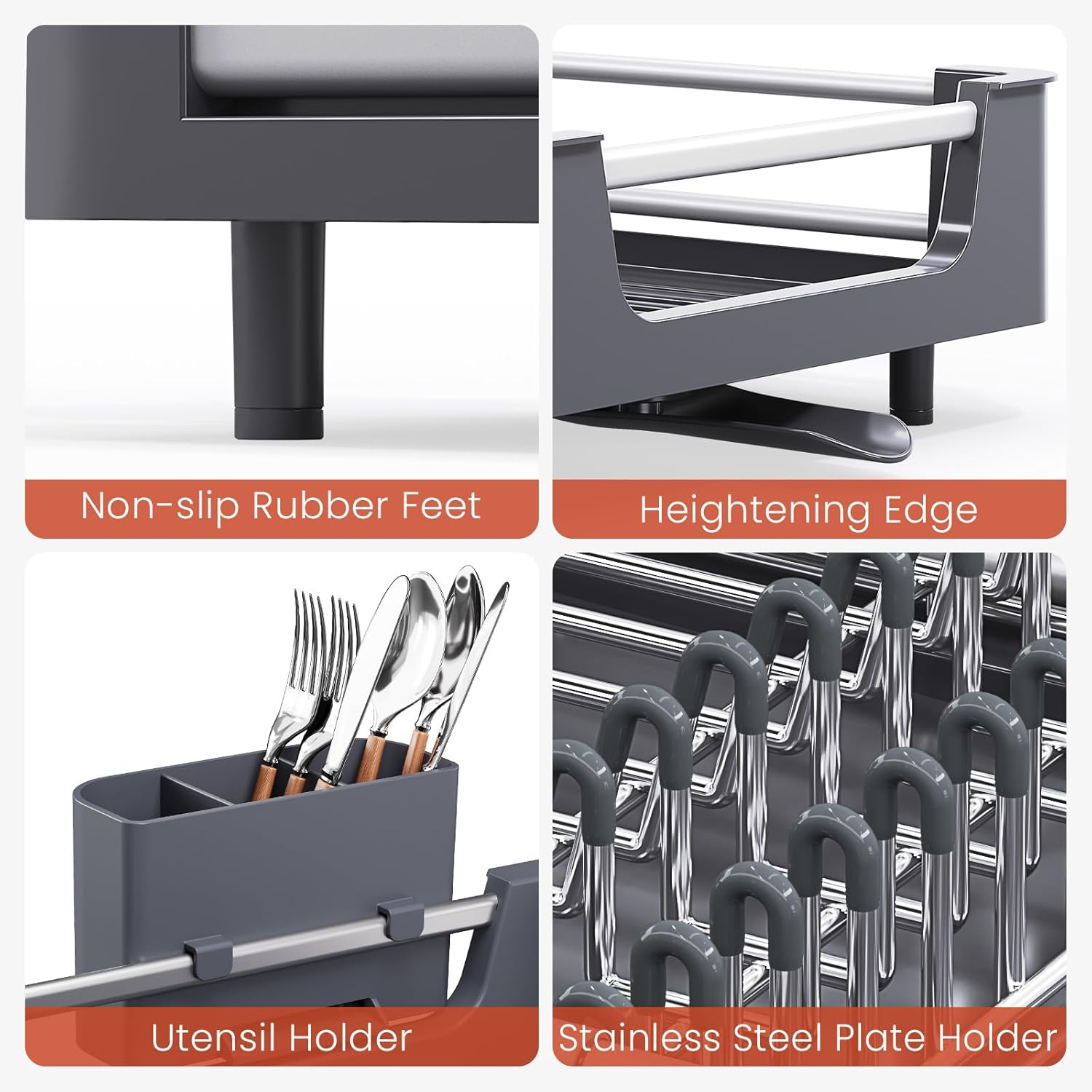 TOOLF Dish Drying Rack for Kitchen Counter, Extendable Dish Rack with Drainboard, Expandable Dish Drainer, Collapsible Dish Strainer with Cutlery Holder, Foldable Home Plate Rack, Alu Gray