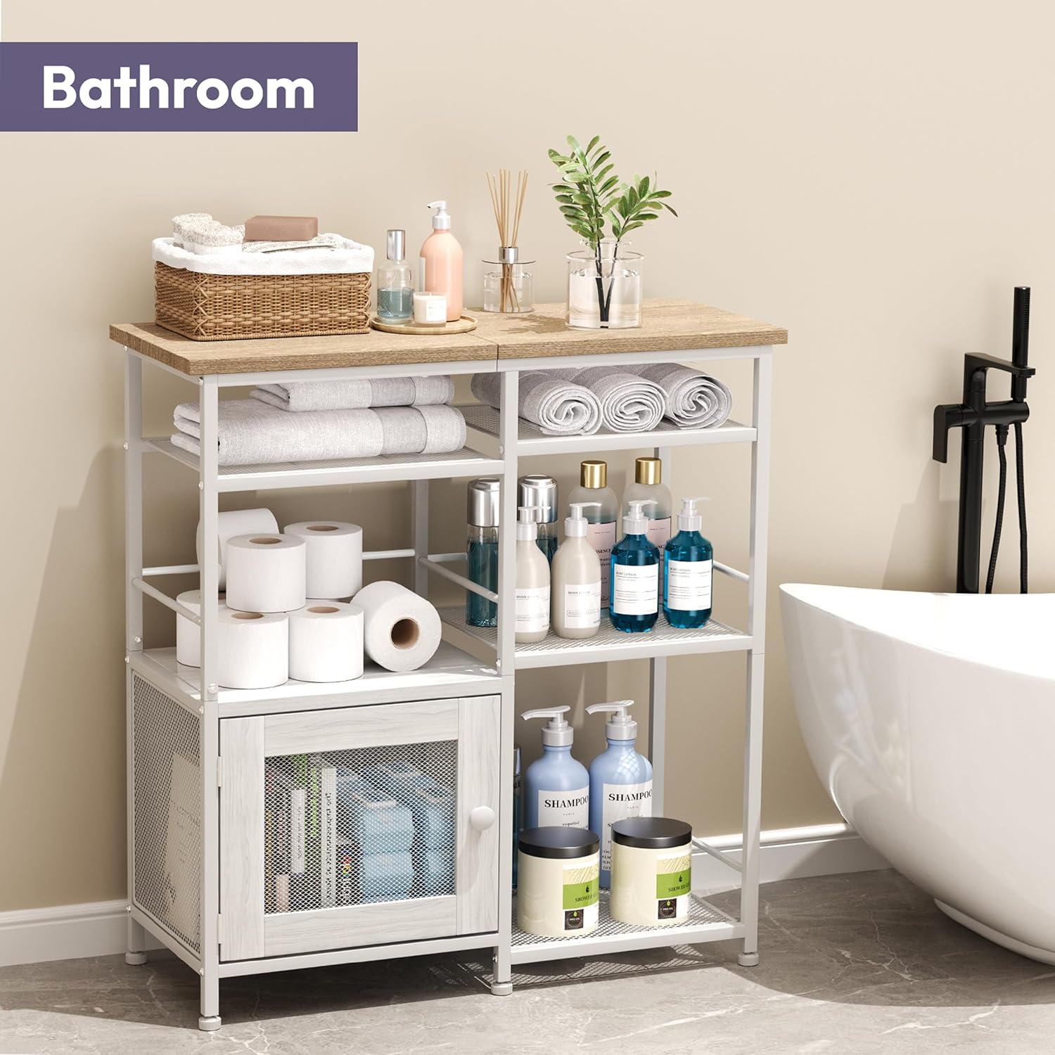 - [Flexible 7-Tier Storage] Kitchen coffee station with storage features a mesh shelf, and cabinet door, offering diverse storage solutions in one compact unit. Organize mugs, utensils, or coffee machines efficiently—coffee cabinet ideal as a small bar cabinet or coffee corner station in homes or offices
