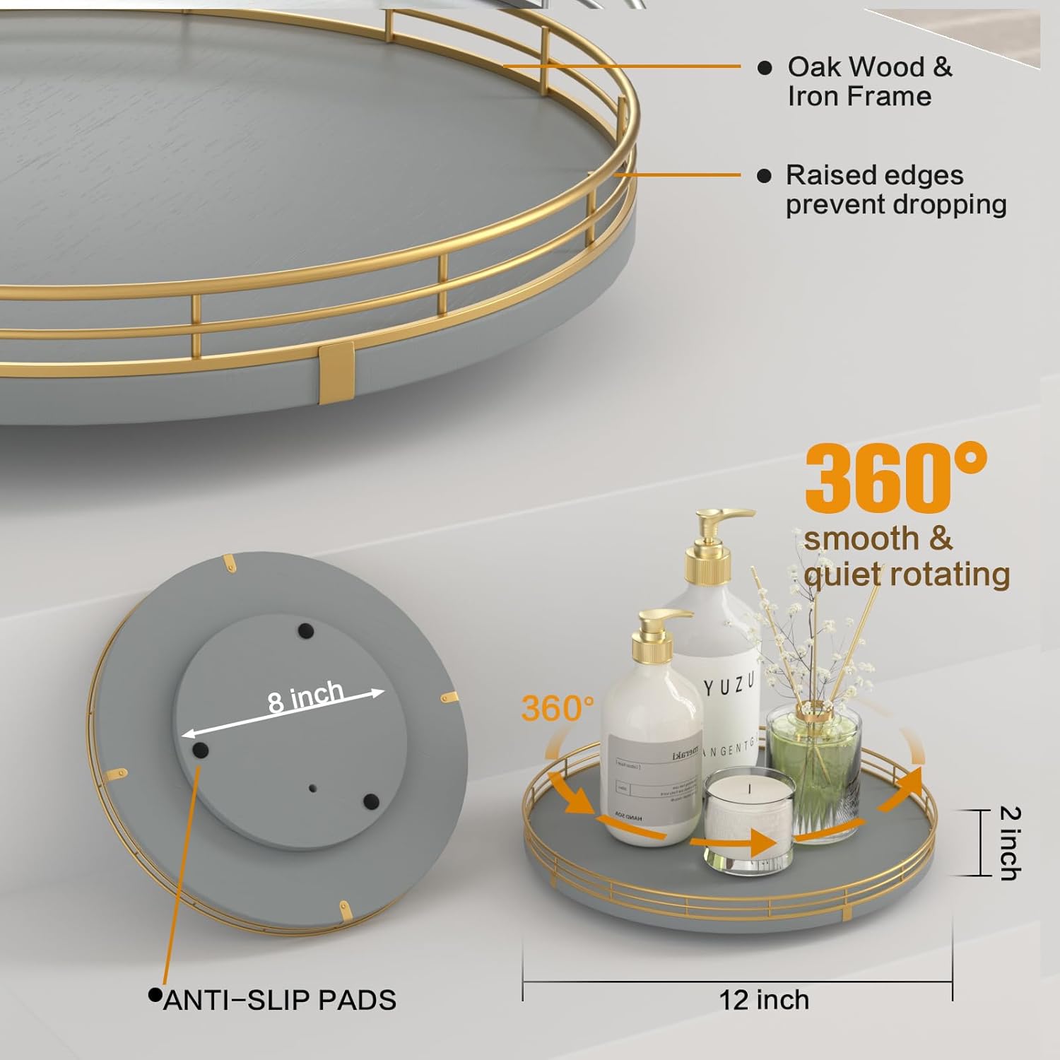 12" Wooden Lazy Susan Turntable for Cabinet – Roud Rotating Spice Rack Organizer, Gray Kitchen Countertop Tray for Dining Table & Pantry Storage (Gray & Gold)
