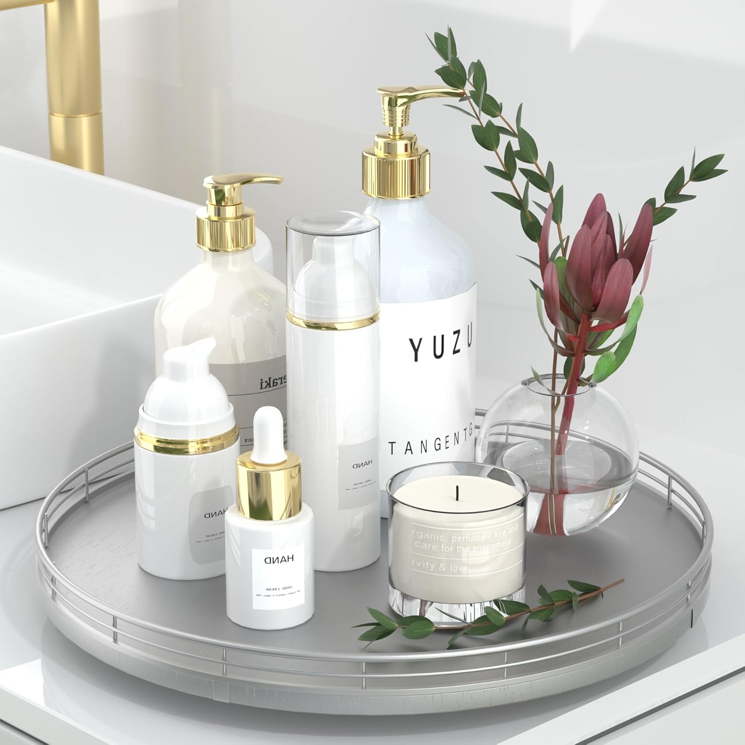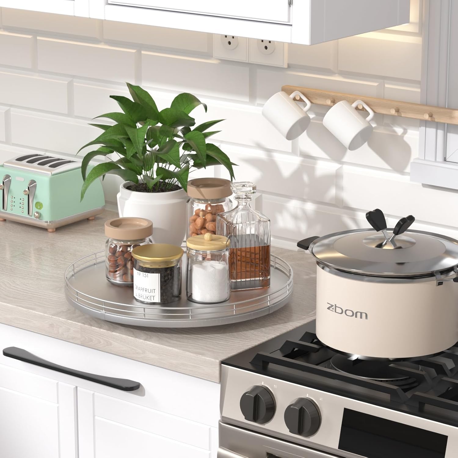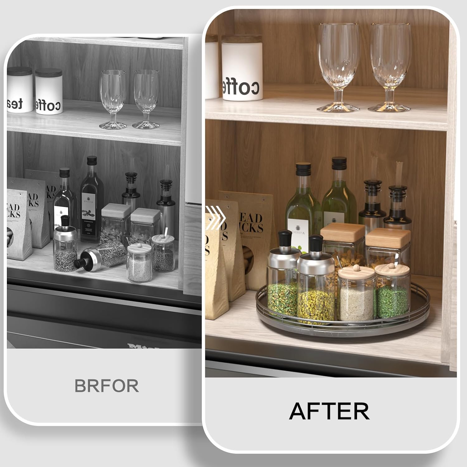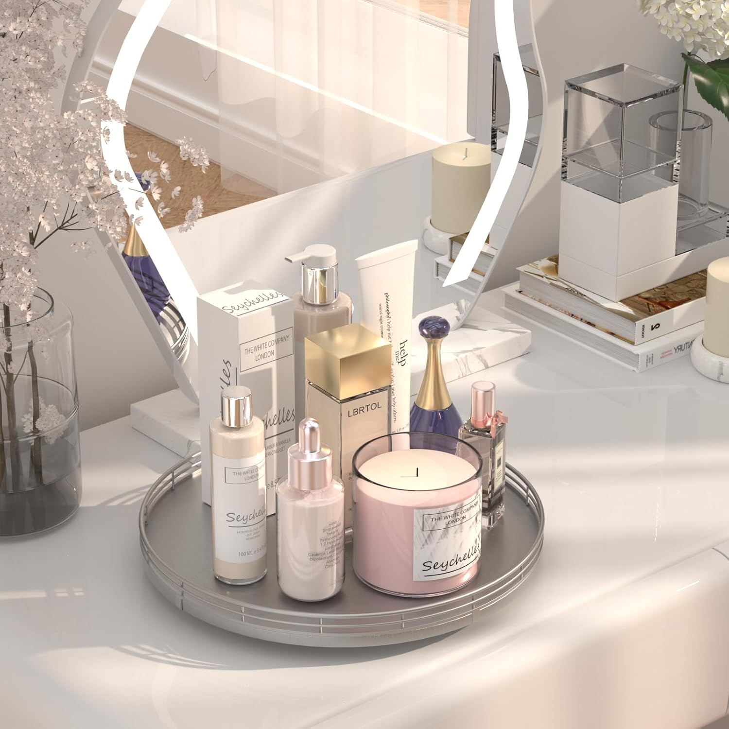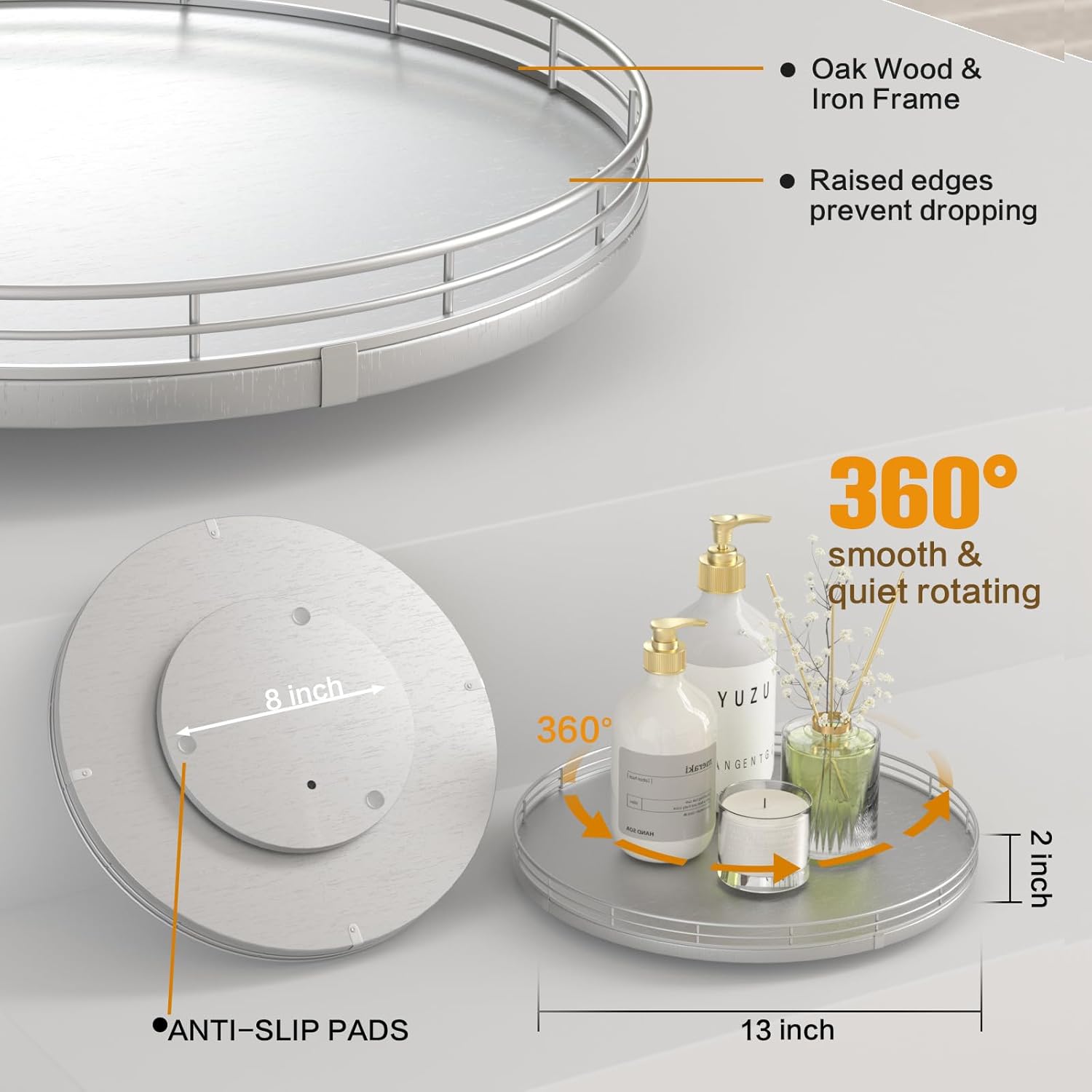 - Thoughtful Design: The turntable silver tray features a smooth and silent 360°rotation; Bottom slip-resistant pads for stability and protect your countertop from scratches; Raised edges on each organizer tray to keep items from falling out; Easy to use, no installation required
