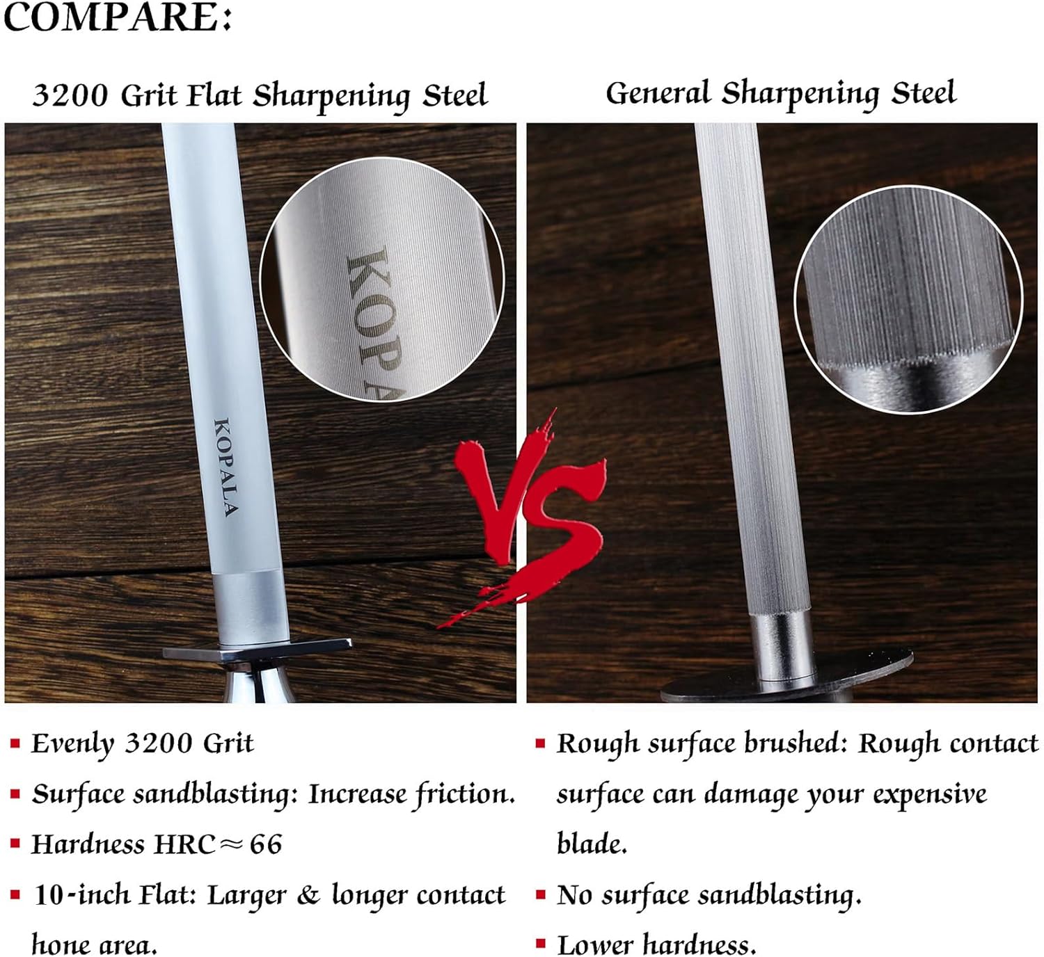 - [Surface Sandblasting Process]: We have additional sandblasting on the rod, which greatly enhances the friction of the sharpening rod, and the 12 inches flat rod has a longer effective distance & contact area than the 10 inches round rod, which will help you correct your blade more effectively;