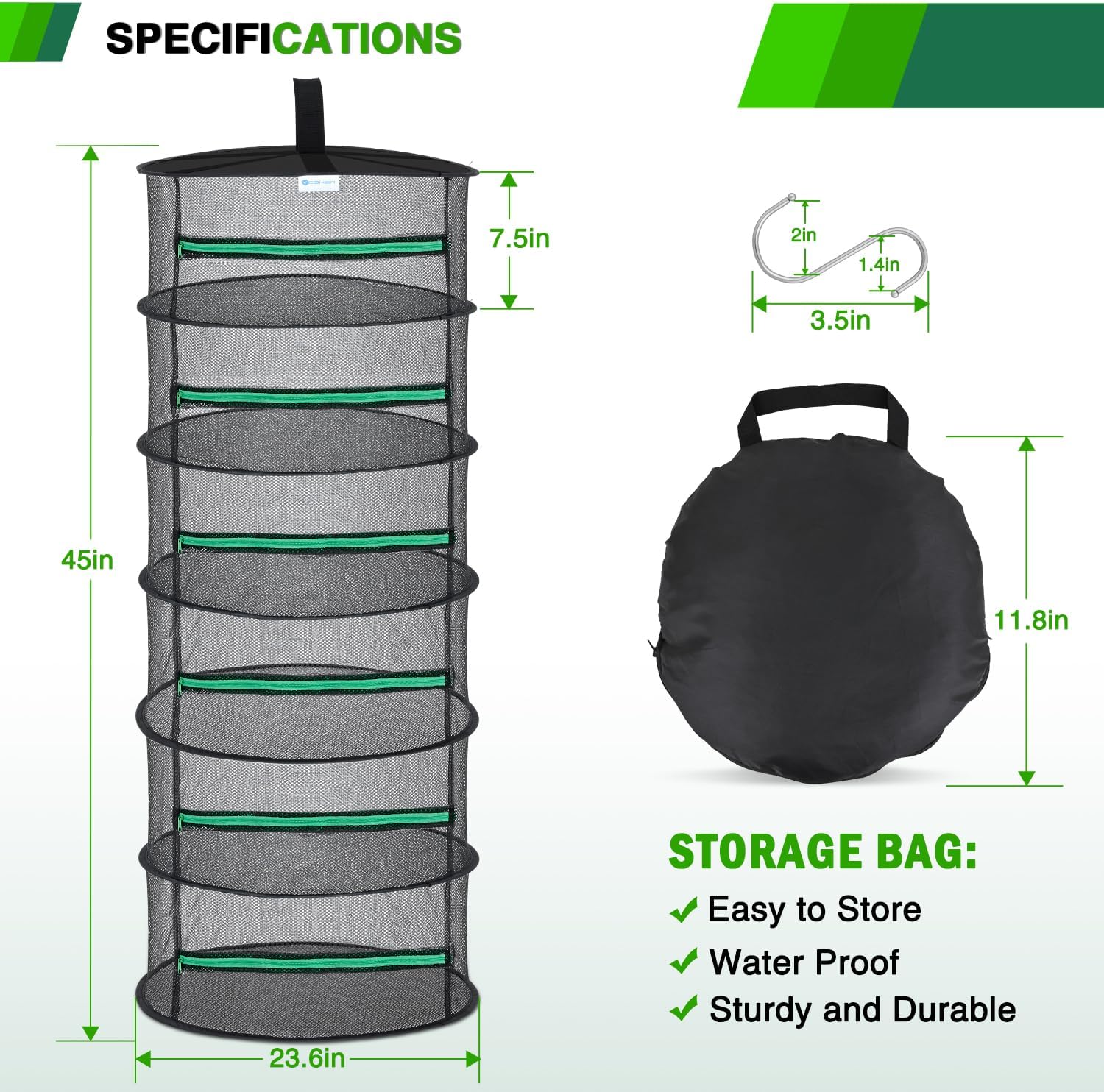- AVAILABLE IN VARIOUS SIZES: The herb dryer hanging rack is available in 4-layer, 6-layer, 8-layer and 3 colors. This plant drying rack is 6-layer, 23.6" in diameter, each grid is 7.5" high, and 45" in total height when unfolded, fits 3x3 or Larger Grow Tents. The multi-layer separated drying net ensures optimal airflow between the trays, thereby achieving faster and more even drying. It provides ample space for flower buds and food to meet all your drying needs. Due to the elasticity of the mesh, slight size variations may occur