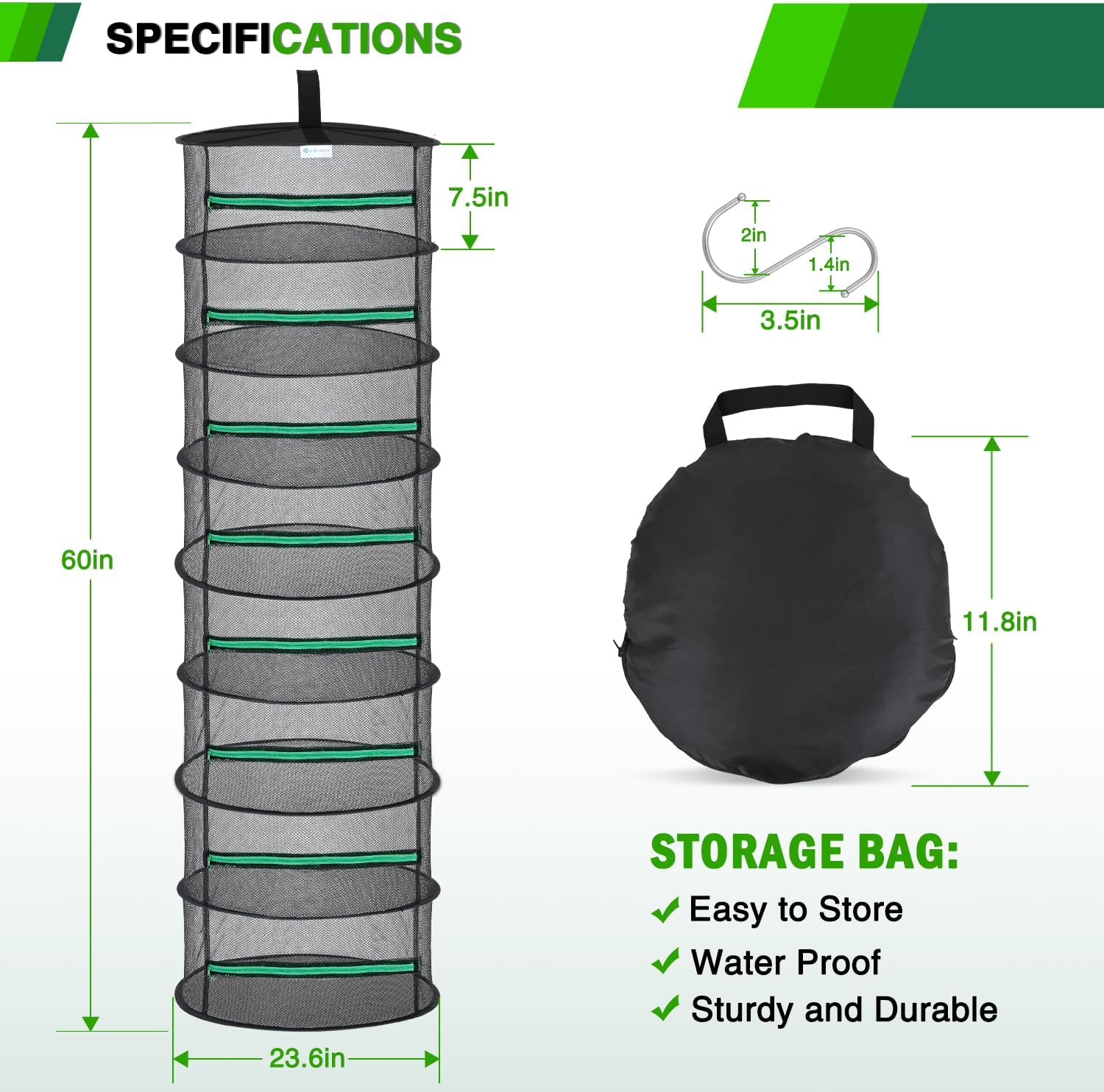 - AVAILABLE IN VARIOUS SIZES: The herb dryer hanging rack is available in 4-layer, 6-layer, 8-layer and 3 colors. This plant drying rack is 8-layer, 23.6" in diameter, each grid is 7.5" high, and 60" in total height when unfolded, fits 3x3 or Larger Grow Tents. The multi-layer separated drying net ensures optimal airflow between the trays, thereby achieving faster and more even drying. It provides ample space for flower buds and food to meet all your drying needs. Due to the elasticity of the mesh, slight size variations may occur