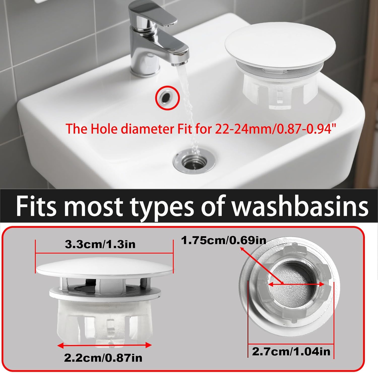 - Universal Fit: This sink overflow cap is compatible with all types of ceramic sinks available in the market. It is designed to fit sink holes ranging from 0.8 inches to 0.91 inches in diameter.