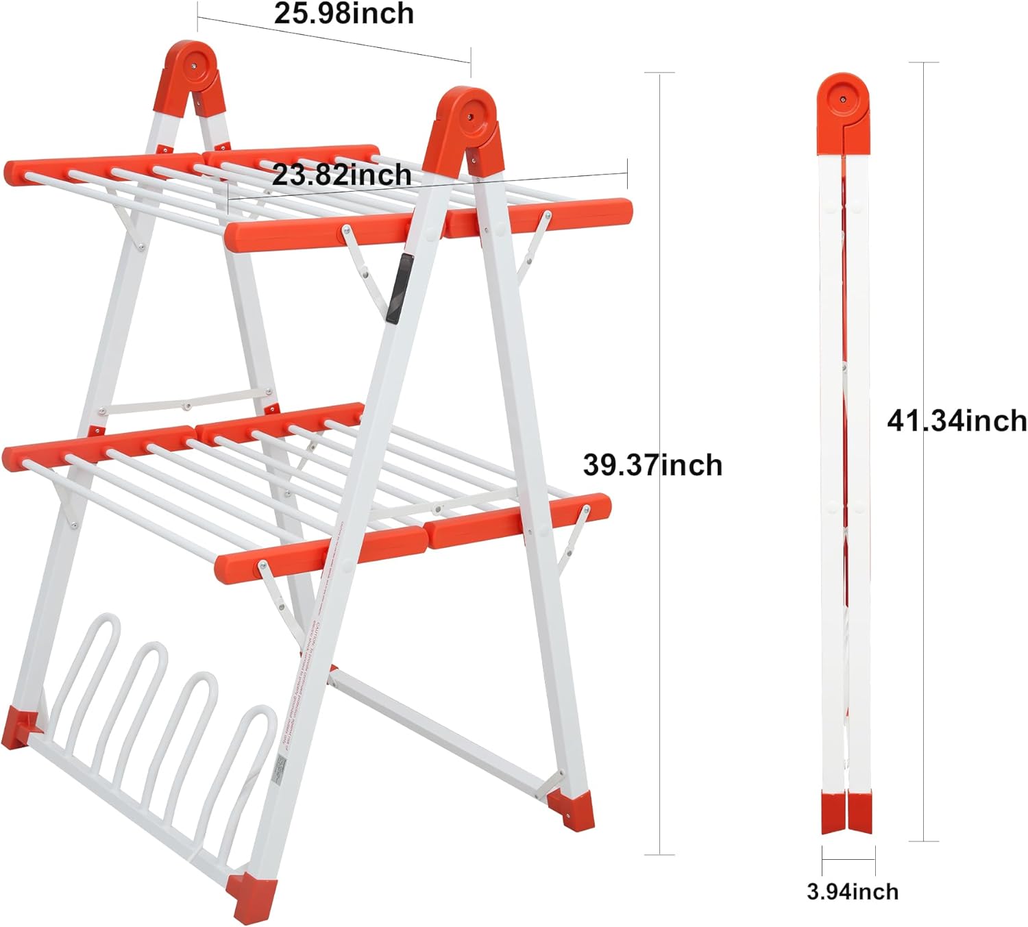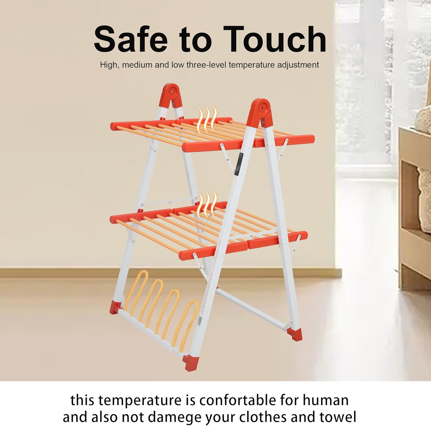 - 【3-Tier Large Capacity Heated Clothes Airer】Dries clothes, towels, and shoes simultaneously! This 2-in-1 electric drying rack replaces bulky dryers, traditional racks, and shoe dryers – perfect for small spaces.
