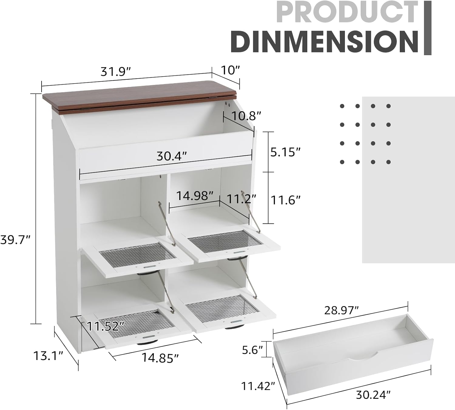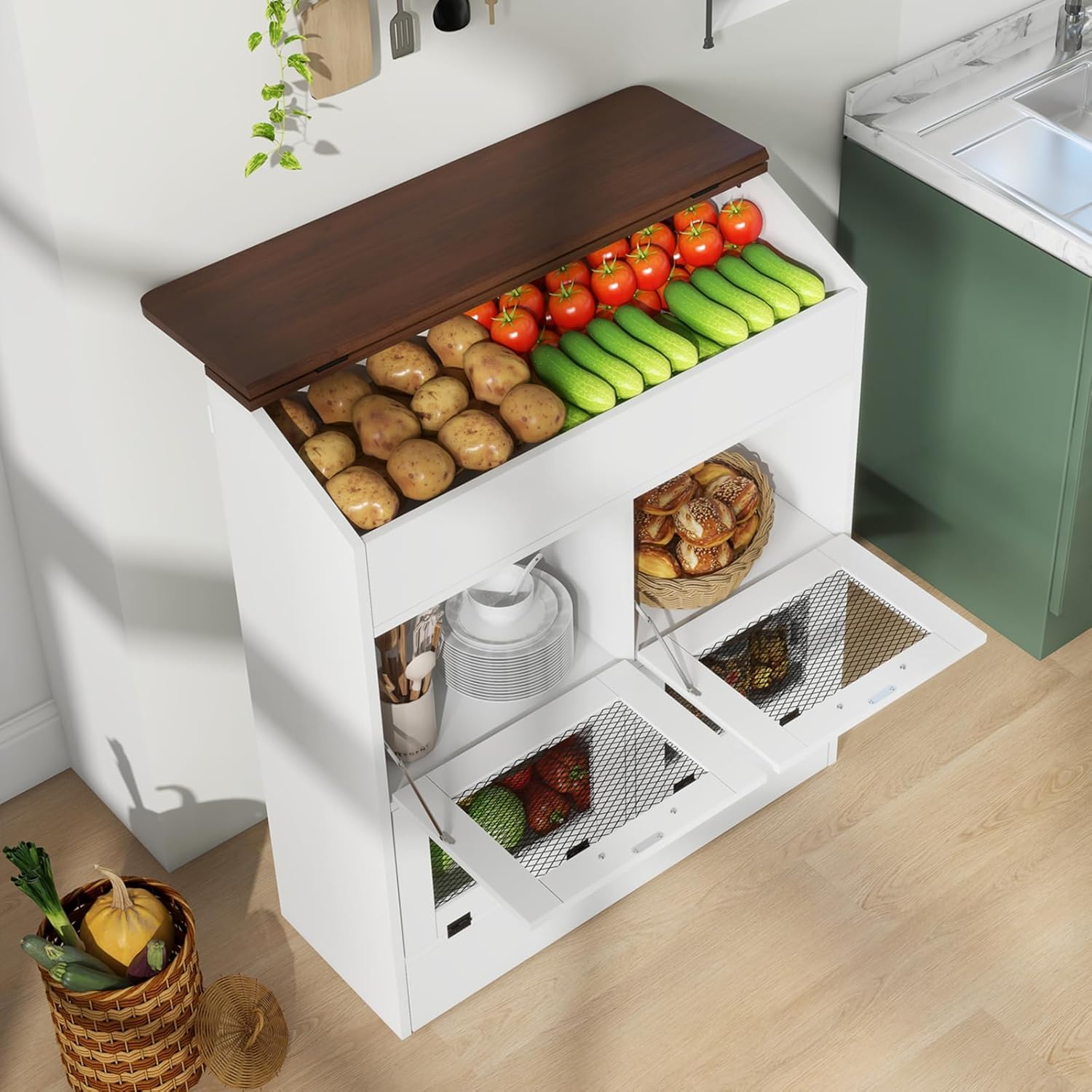 - 🏡️[Elegant & Versatile Potato Storage Bin]: Crafted with premium P2 engineered wood, our potato bins for kitchen combines durability with farmhouse elegance. The white frame with natural wood finish complements any kitchen style from modern to rustic, offering both functionality and aesthetic appeal.