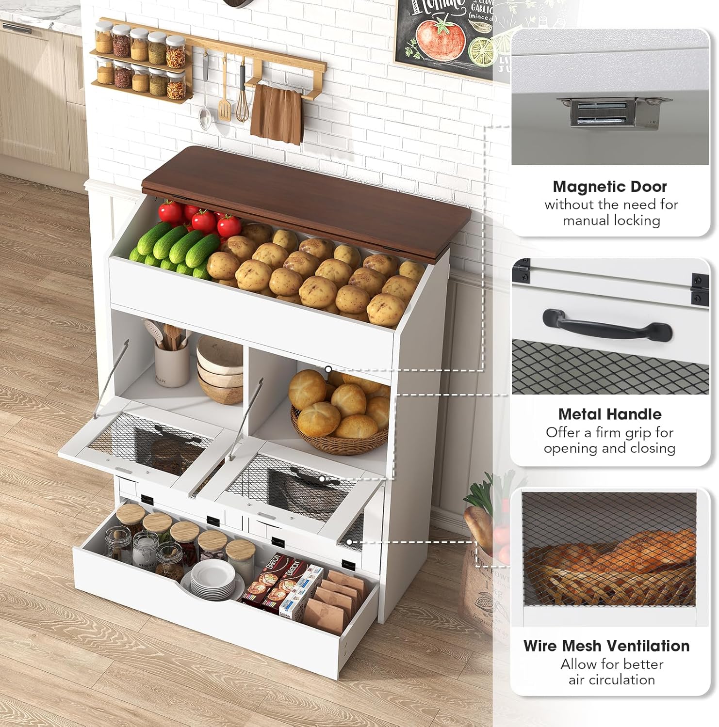 Patiorama Wood Potato and Onion Storage Bin Box, Large Vegetable Storage Box w/Lid,Wooden Bread Storage Bin w/4 Mesh Doors,Movable Bottom Drawer, Farmhouse Potato Storage Bins for Kitchen Pantry White