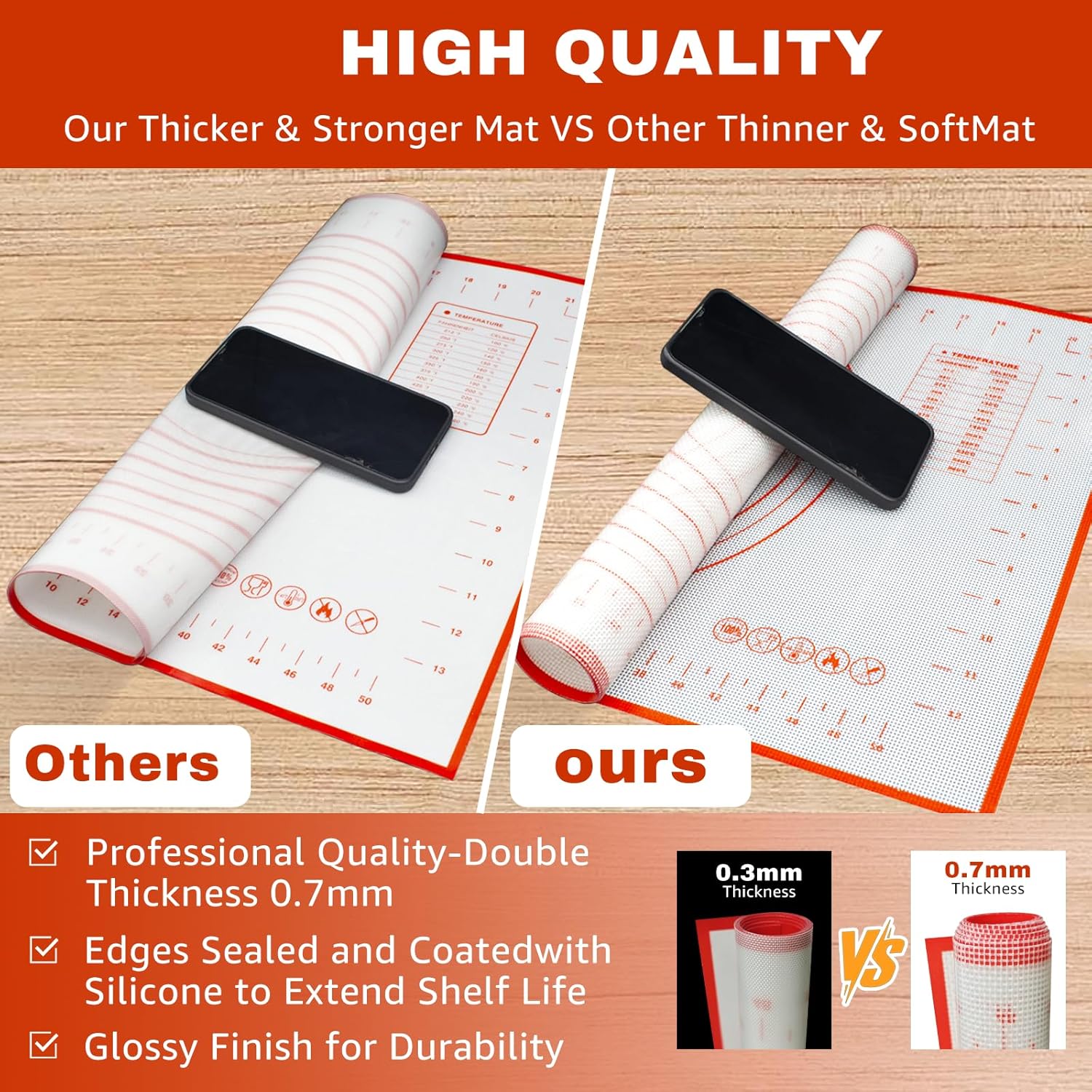 - Double Thickness & High Quality Baking mat: The silicone mats for kitchen counter is added the material of fiberglass to reinforce the mat, which’s thichkness is 0.7MM, is almost twice thicker than other baking mats(0.3MM). And our silicone baking mat is hard wearing and not wrinkle when used, which can stay good on the table