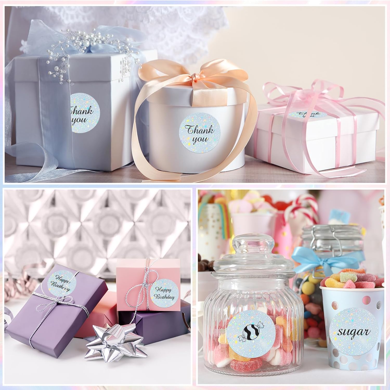 - Wide range of uses: Holographic Thermal label stickers are suitable for gift packaging, sealing stickers, address stickers, color coding, food labels, storage boxes, storage jars.