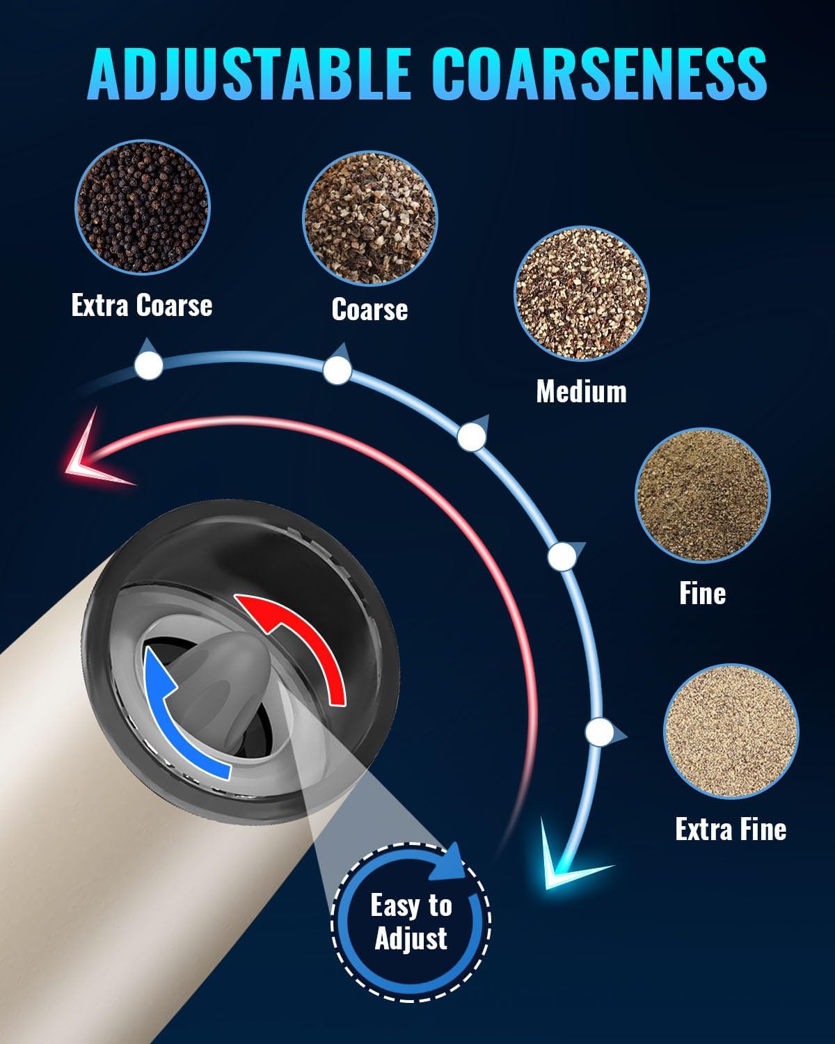 - 【ADJUSTABLE COARSENSESS】 Our electric salt or pepper grinder set just rotate clockwise to grind into fine grains and counterclockwise to grind into coarse grains. You can easily adjust the coarseness of spices according to your preference.
