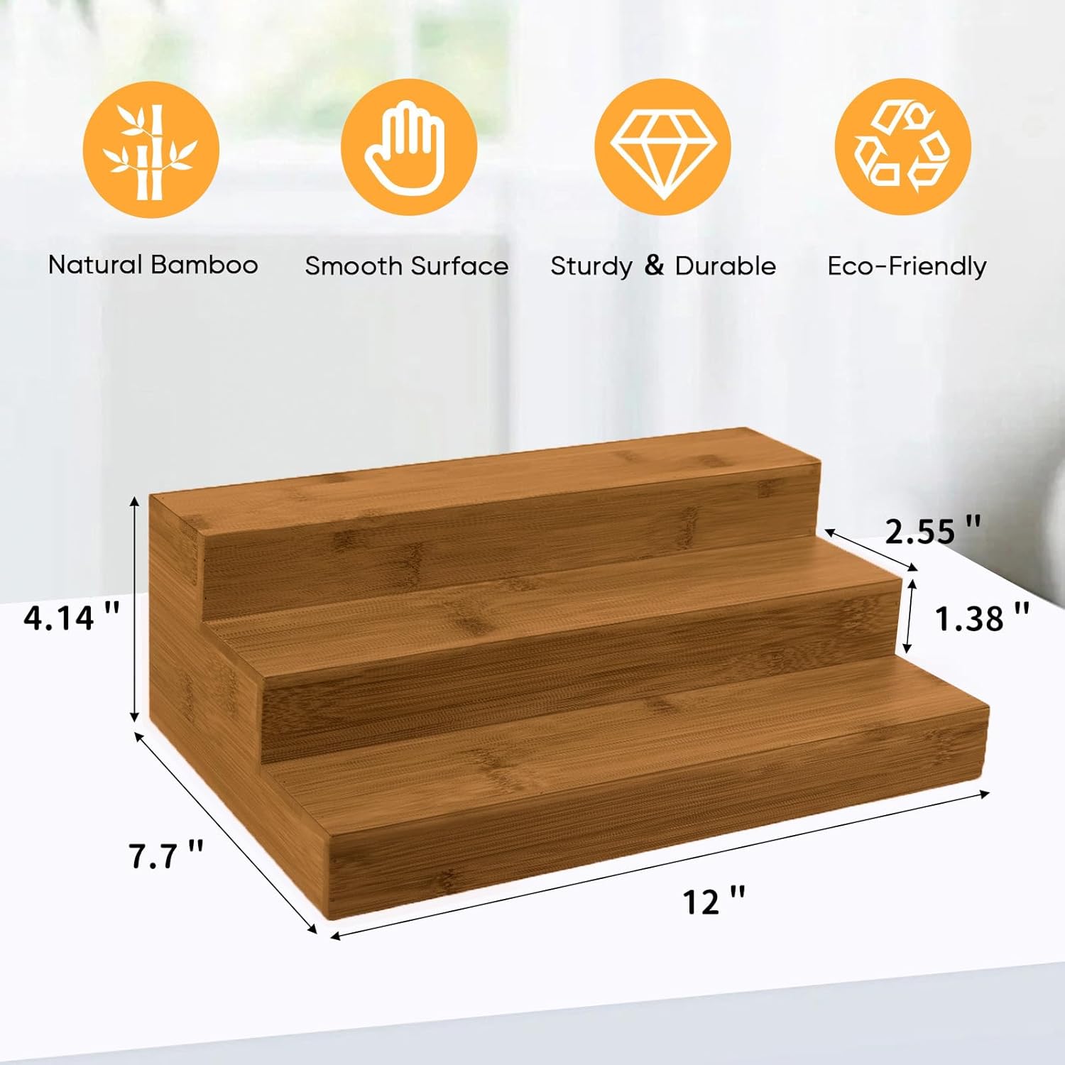 - 📐Size: 12 x 7.7 x 4.14 inch (L x W x H). Each step is 2.55 inches width, suitable for spice bottles & jars, drink, sauces, jelly jars, vitamin and medicine bottles. 🧡 Please measure your cabinet size before purchase. (Spice Jars Not Included)