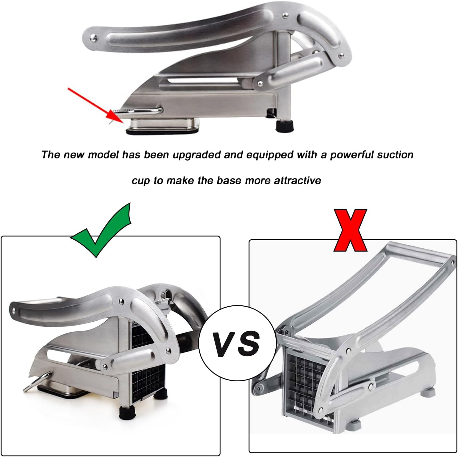 - 【MULTIPURPOSE】Potato cutter machine comes with 2 easily interchangeable blades, providing perfect cutting results for regular or thinner sized fries. It's perfect for cutting potatoes, carrots, vegetables, onions, zucchinis, cucumbers. You can also cut sweet potatoes, we recommend microwaving them for 1 minute first to soften, then let them cool before handling