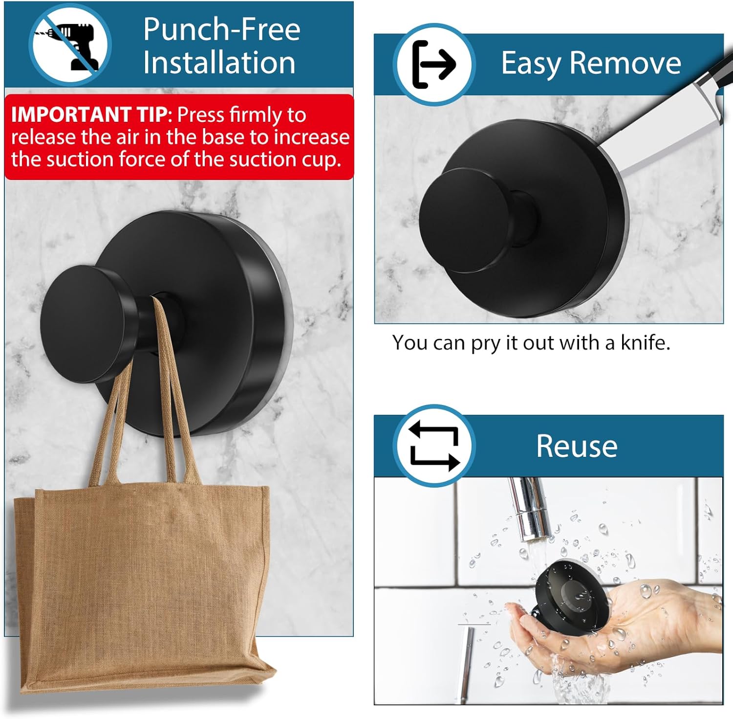 Suction Cup Hooks for Shower, 4 PCS No-Drill Towel Holder for Bathrooms Wall, Glass Door, Mirror, Tiles, Kitchen, Hold Robe & Wreath, Hanging up to 15 lbs – Waterproof & Rustproof, Matte-Black