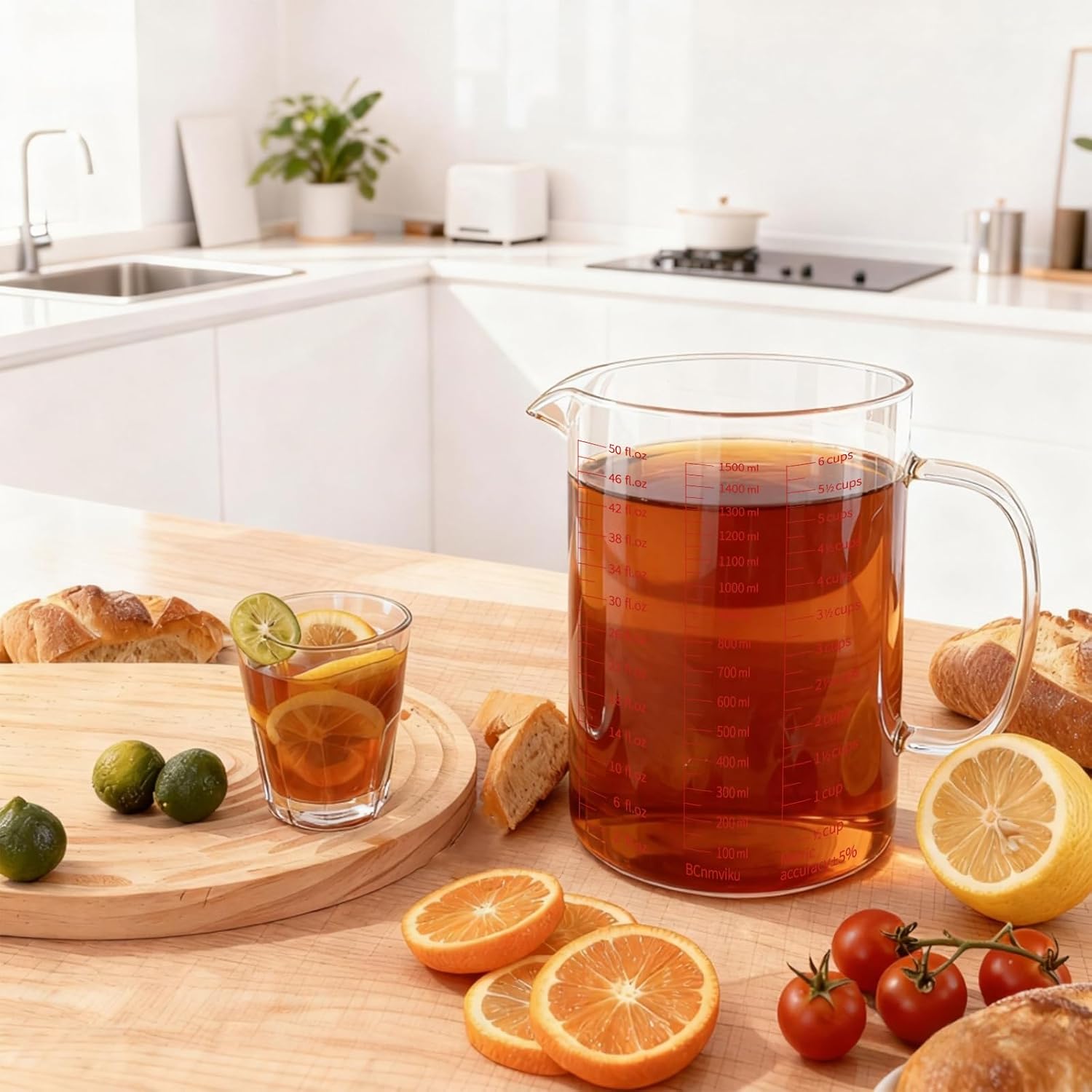 BCnmviku Glass Measuring Cups High Borosilicate [Insulated Handle | V-Shaped Spout]For Prepping Baking and Cooking Preheated Oven Dishwasher Freezer and Microwave Safe (1500 ml with silicone)